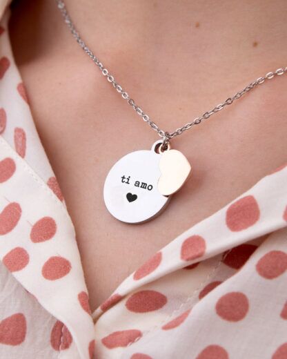 Meraviglioso ciondolo inciso con le parole “Ti amo”. Un romantico regalo per la vostra compagna in occasione dell’anniversario oppure di San Valentino. Il ciondolo circolare in acciaio viene parzialmente coperto, quindi andando a celare la frase, da un secondo ciondolo a forma di cuore dal colore rosè. Venduto in un’elegante scatolina bianca con il nostro logo in oro e nastro in doppio raso.