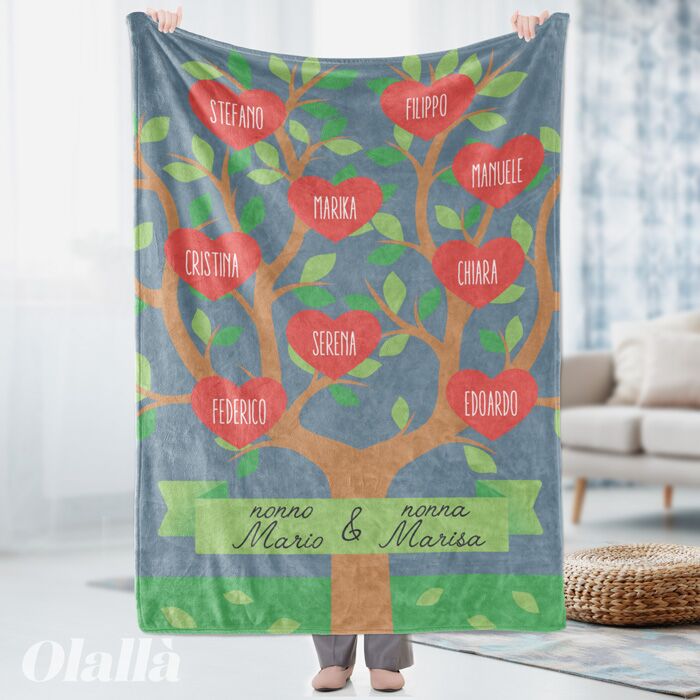 Coperta in soffice pile con albero della vita che rappresenta tutta la famiglia. Ideale per fare un regalo originale e coccoloso ad una coppia, per celebrare la loro unione, in occasione di un anniversario importante, il Natale, la Festa dei Nonni, il compleanno.