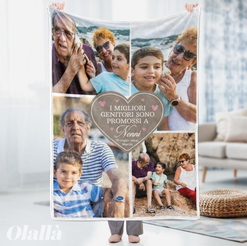 Coperta in soffice pile con collage di 4 foto e la vostra dedica speciale su un cuore grigio al centro. Ideale per fare un regalo originale e coccoloso ai vostri nonni preferiti. Ti basterà trovare 4 belle foto di loro assieme ai loro nipoti per realizzare uno dei regali più apprezzati dai nonni di tutta Italia!