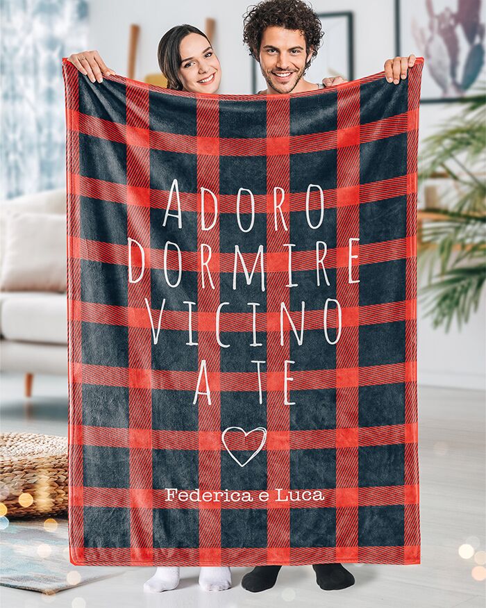 Plaid Coperta in Pile Tartan Personalizzata con Dedica “Adoro Dormire Vicino a Te” – Idea Regalo Natale Lui, Lei