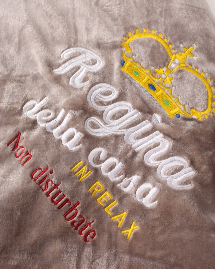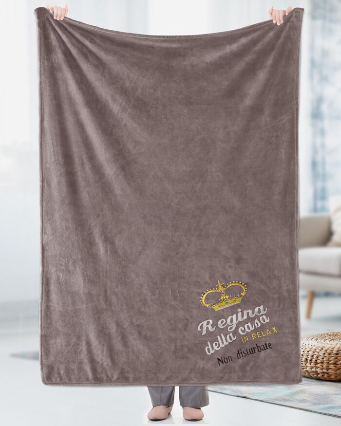 Calda coperta plaid ricamata con frase “Regina della casa in relax non disturbate”.