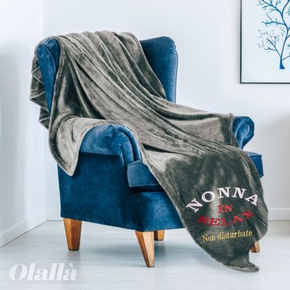 Simpaticissima e caldissima coperta plaid con ricamo Nonna in Relax non Disturbare. Pensata per allietare l’agognato riposo della nonna alla fine di una lunga giornata, sarà un regalo simpatico e al tempo stesso utile per la festa dei nonni, il compleanno o il Natale.