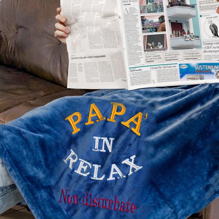 Utile e caldissima coperta plaid per il Papà che può tutto: da utilizzare nei momenti di relax, particolarmente indicata quando i bimbi non sono in circolazione! Questa soffice coperta permetterà al vostro babbo di godersi sonni tranquilli sul divano senza essere disturbato. Stupisci il tuo papà del cuore con questa divertente coperta, da regalare nel giorno della sua festa!
