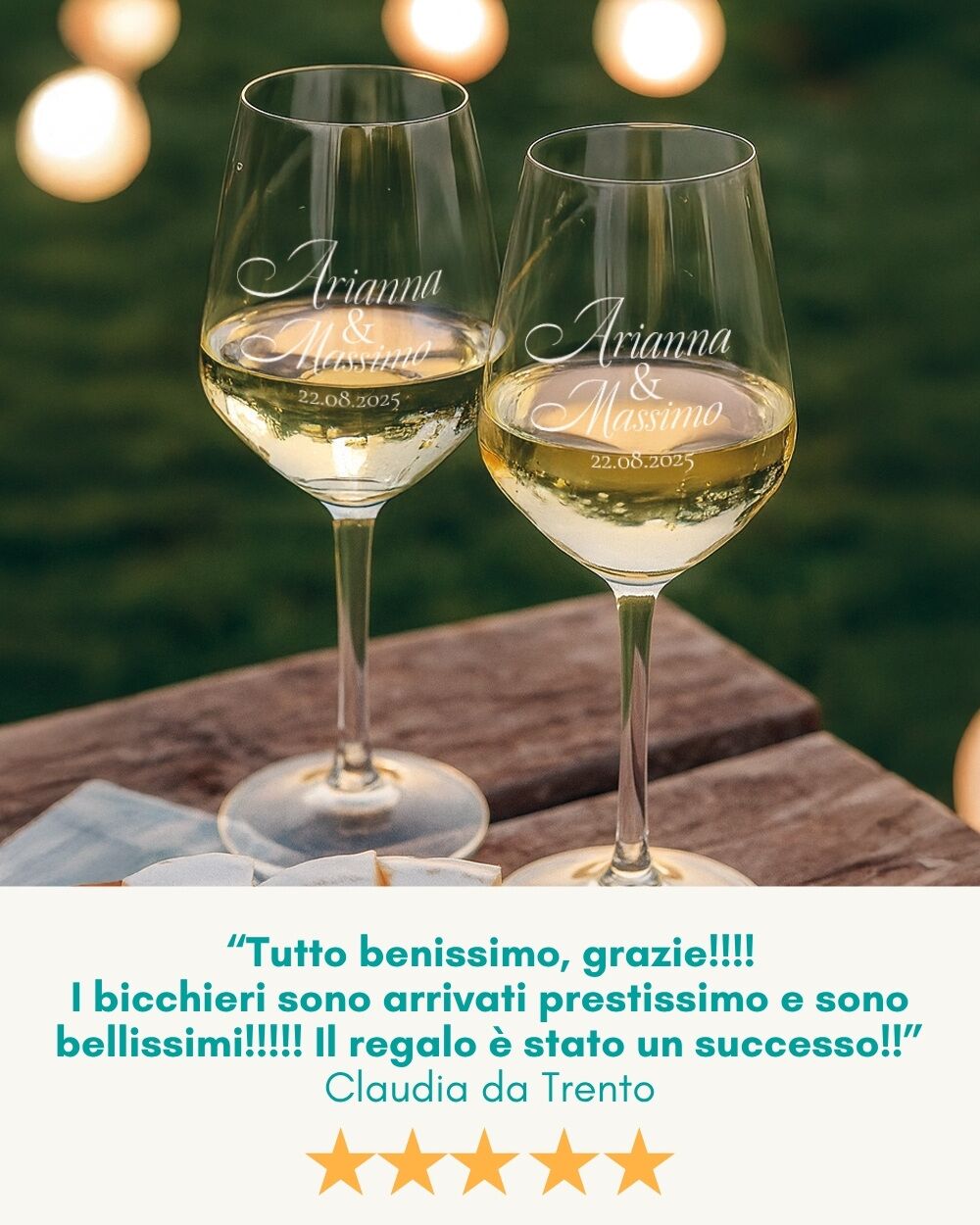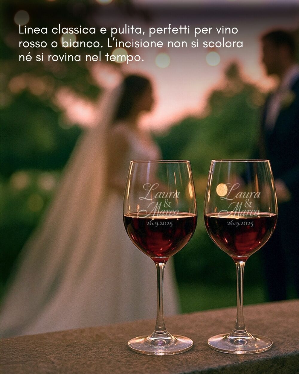 Ogni nome e ogni data sono incisi con precisione per un effetto satinato elegante. L’incisione è resistente e i calici possono essere lavati in lavastoviglie.