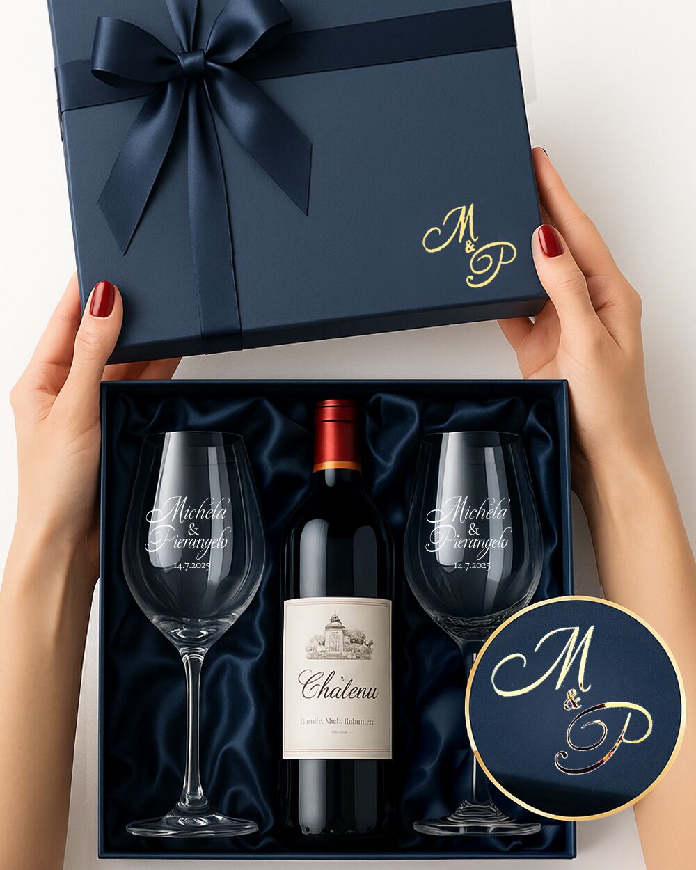 Puoi aggiungere la nostra scatola regalo deluxe rivestita in carta Favini blu con fiocco in raso tono su tono per ricevere a casa un dono pronto da regalare. Con un piccolo extra puoi anche aggiungere la stampa in oro a caldo sul coperchio delle iniziali della coppi. Un dettaglio esclusivo che stupirà sicuramente chi li riceve in dono.