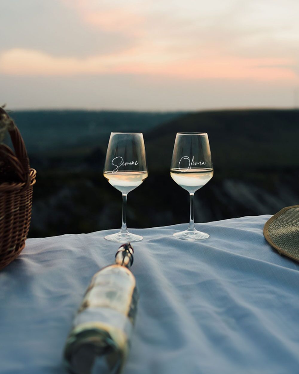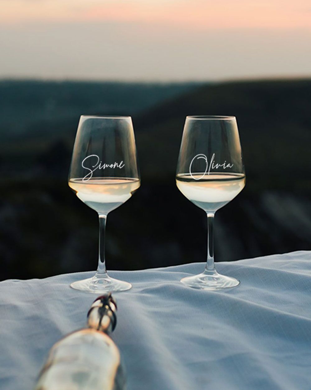 • Personalizzazione unica con incisione a laser: Ogni calice è personalizzato con un’incisione a laser di precisione, garantendo un risultato elegante e duraturo. I nomi incisi in un raffinato stile calligrafico aggiungono un tocco di classe e rendono ogni calice un pezzo unico.