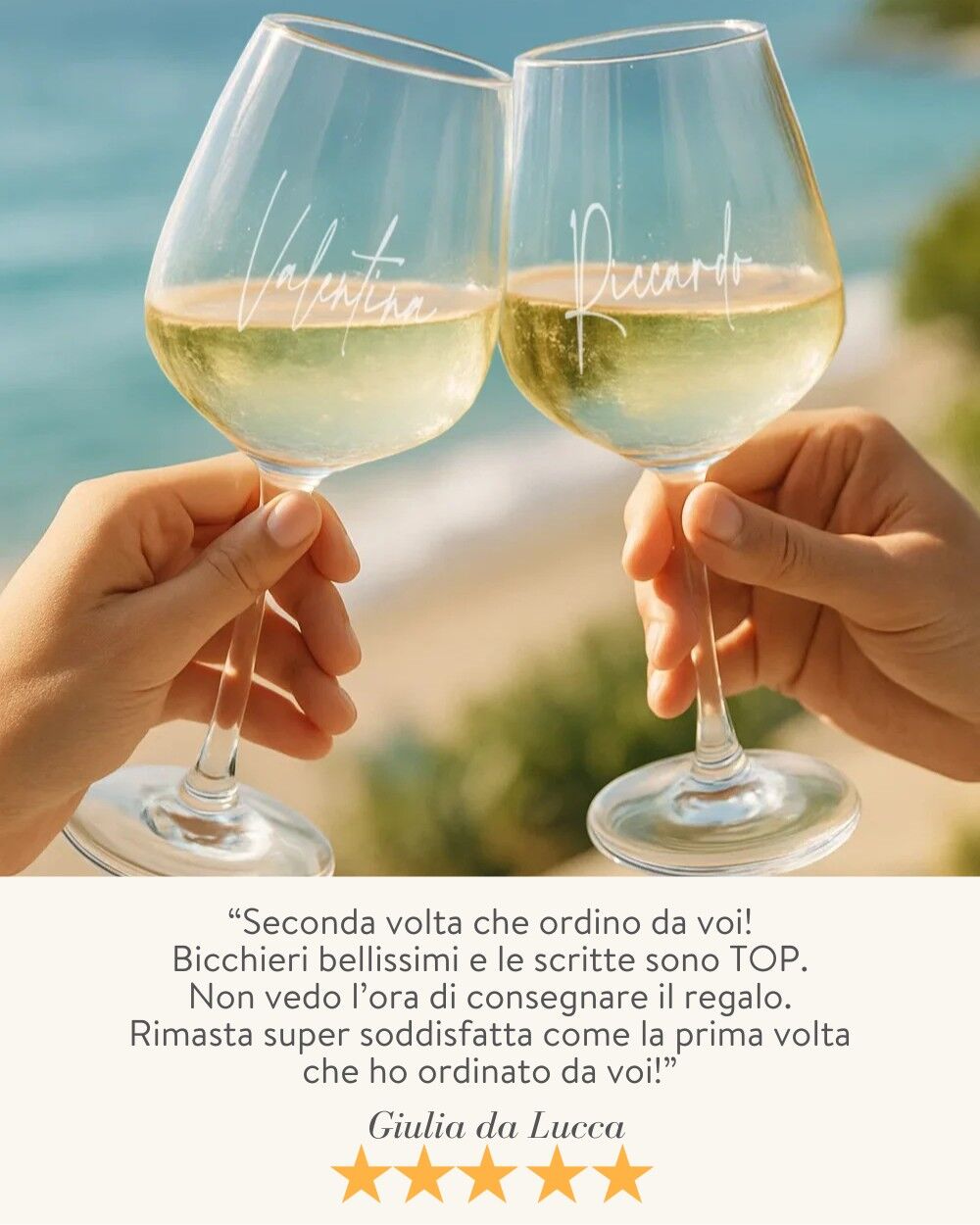 È andato tutto benissimo! I bicchieri personalizzati con i nomi sono stati apprezzatissimi dai riceventi nonché festeggiati, ma la raffinatezza del packaging è veramente outstanding! Voglio ringraziare la signorina che ha risposto al vostro numero telefonico ieri: gentilissima, empatia ed efficientissima, tanto è che tutto è arrivato perfetto ed in time. Non trascuriamo la puntualità è gentilezza del corriere BRT e la cura che è stata usata x l’imballaggio fei calici! Once ahain grazie mille e complimenti x la vostra serietà e competenza. Luciana