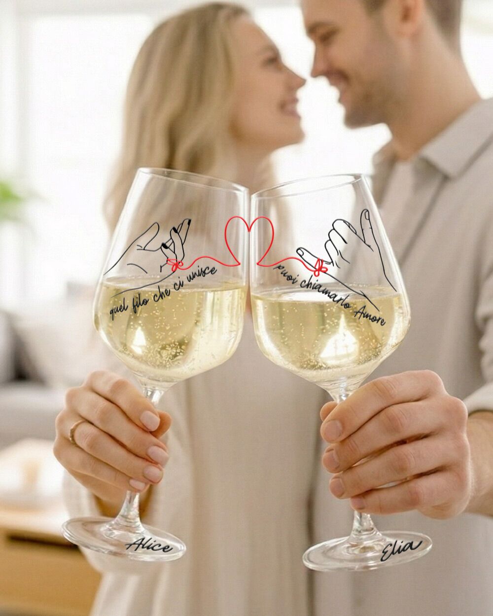 Ogni calice porta impresso il nome del destinatario direttamente sulla base, grazie alla grafica romanticamente illustrata con il filo che li unisce. Il risultato è un regalo di anniversario per coppia che unisce estetica e sentimento in modo autentico.