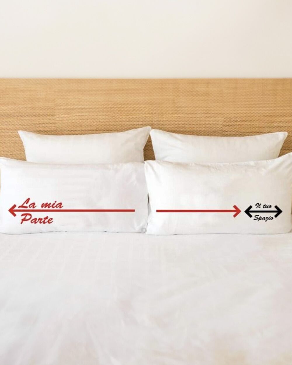 2. Grafica Divertente e Simpatica: la grafica delle federe è pensata per far capire chi della coppia occupa più spazio a letto. È un modo scherzoso per evidenziare le dinamiche di coppia e strappare un sorriso ogni volta che essere verranno viste.
