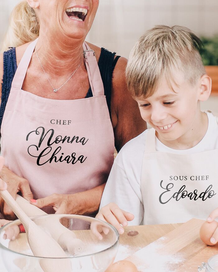 Sorprendi la nonna amante della cucina con questo splendido grembiule personalizzato, abbinato al grembiule del suo nipotino. Sarà una sorpresa unica e pensata per stupire la nonna in occasione della prossima Festa dei Nonni.