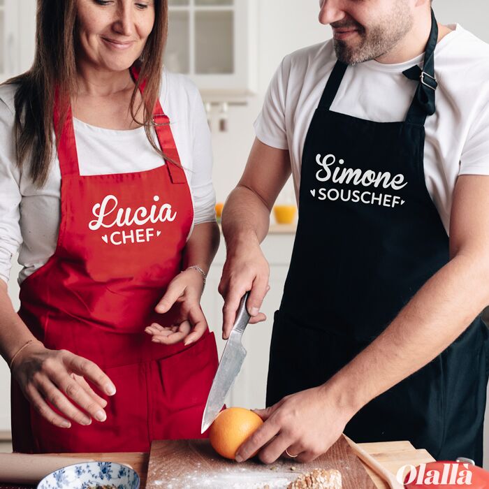 Il prodotto comprende i due grembiuli “Chef” e “Souschef”, personalizzabili con i nomi come indicato in foto.
