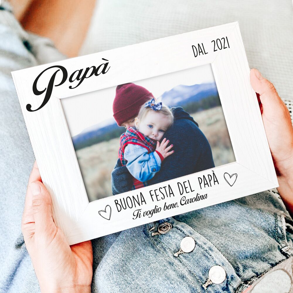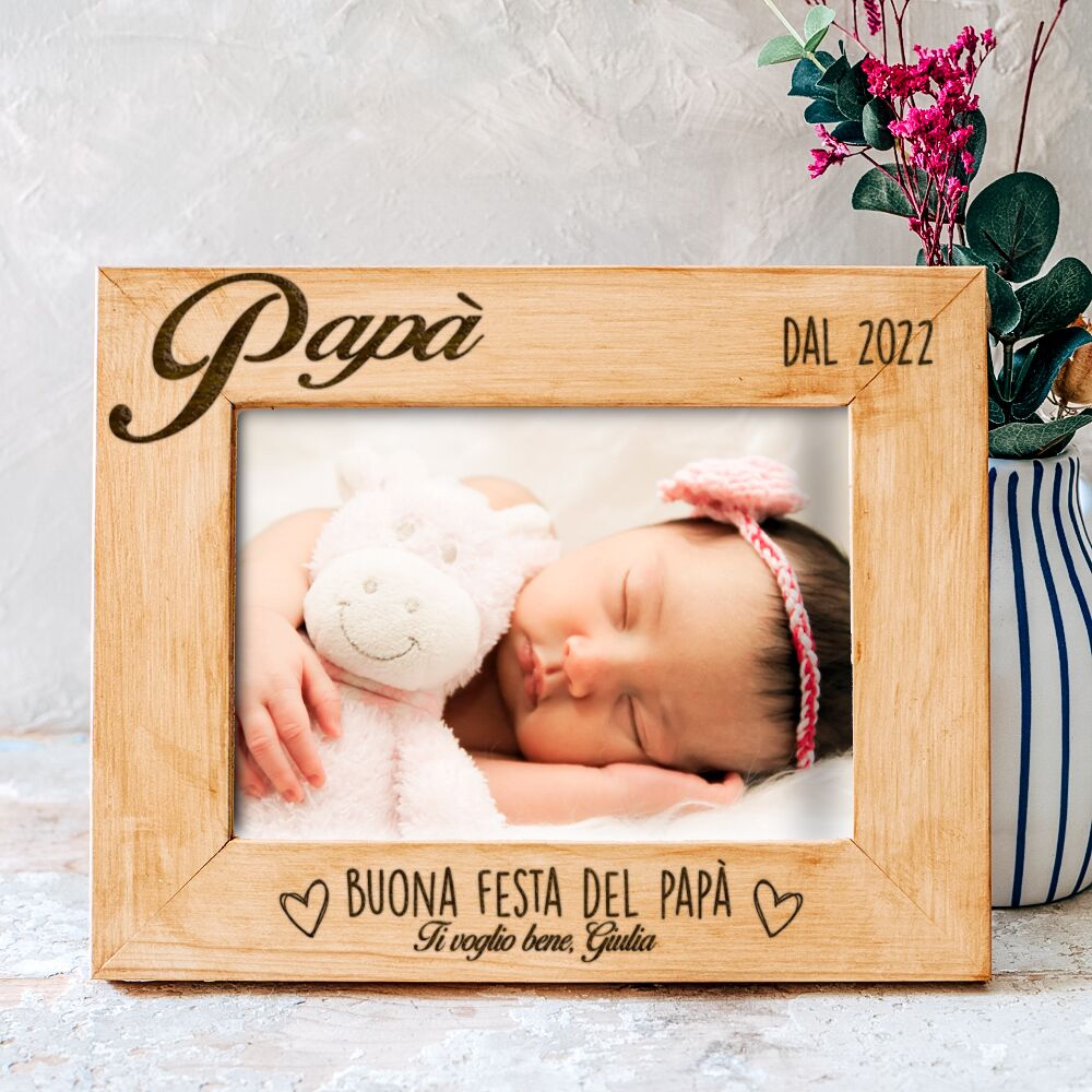 Cornice personalizzata con le tue parole per celebrare un momento magnifico nella vita di ogni padre. Rendi magica la prima festa del Papà con questo regalo da conservare per sempre! Disponibile in varie finiture di legno, stampata o incisa, anche con foto inclusa pronta per essere donata!
