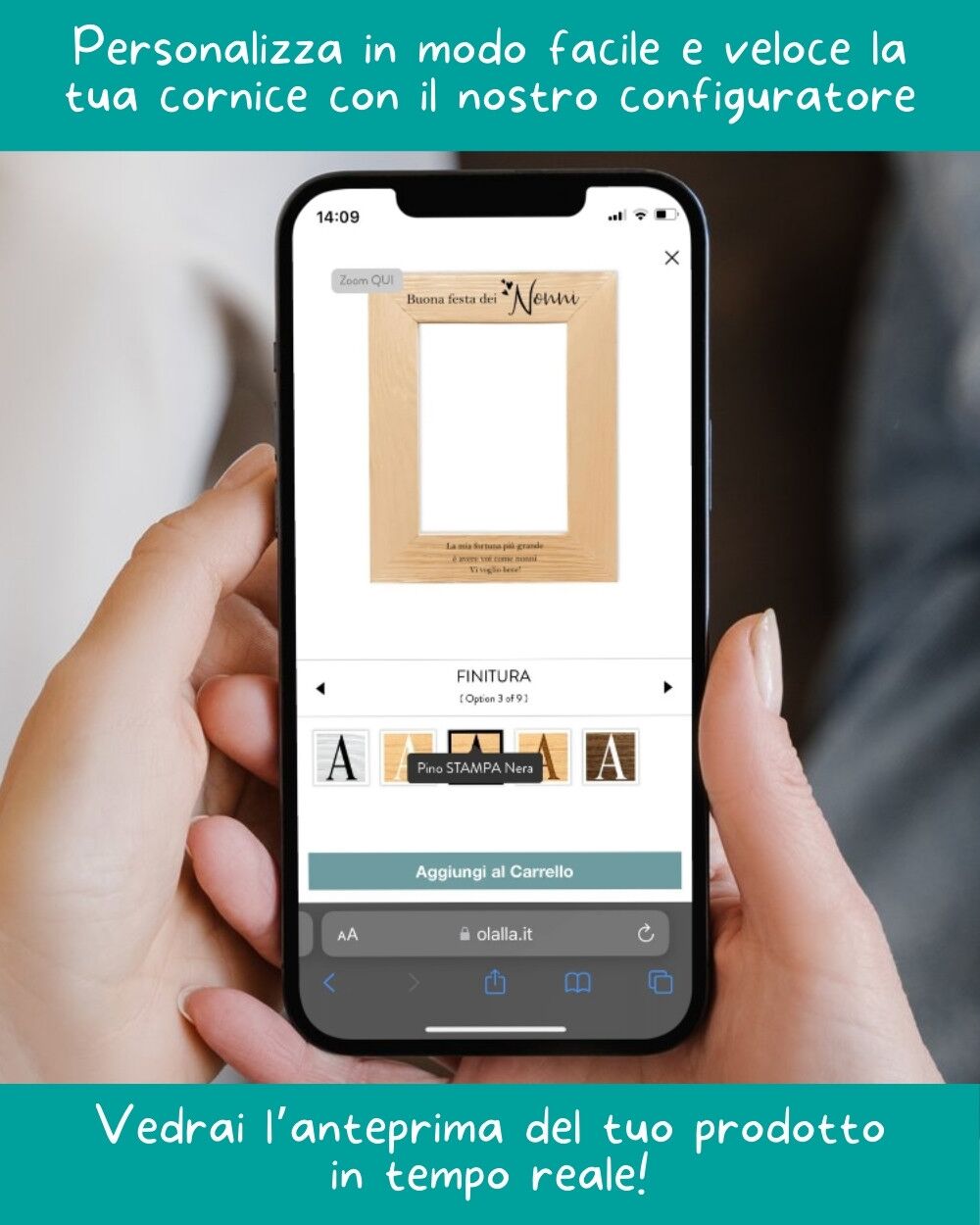 Utilizza il configuratore per vedere la tua cornice personalizzata in tempo reale. Completala passo per passo seguendo le indicazioni.