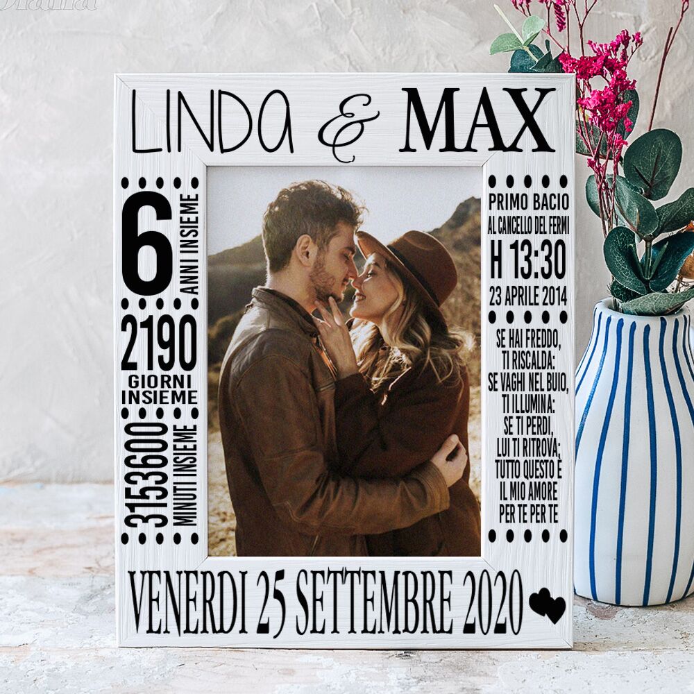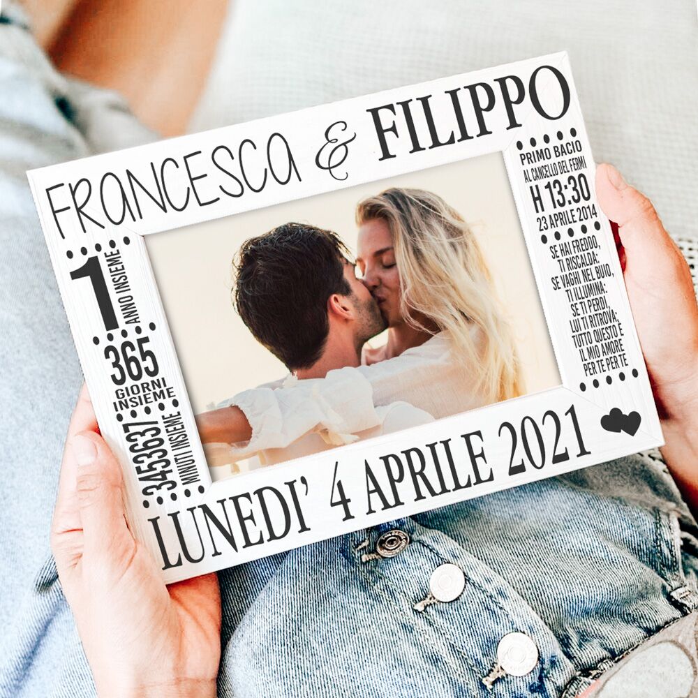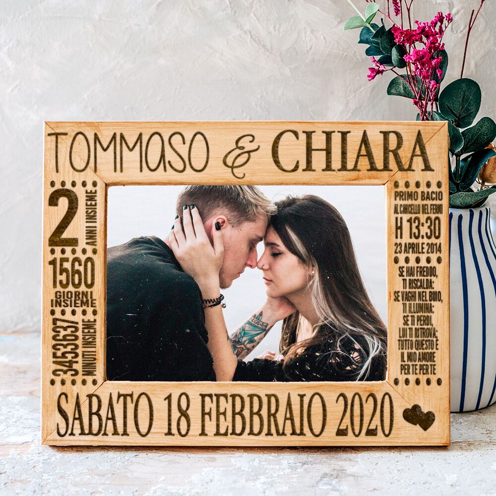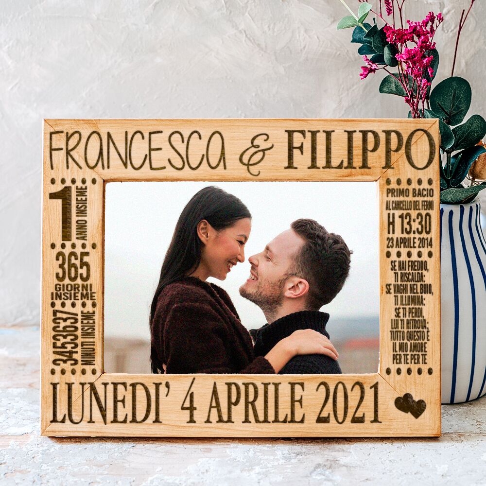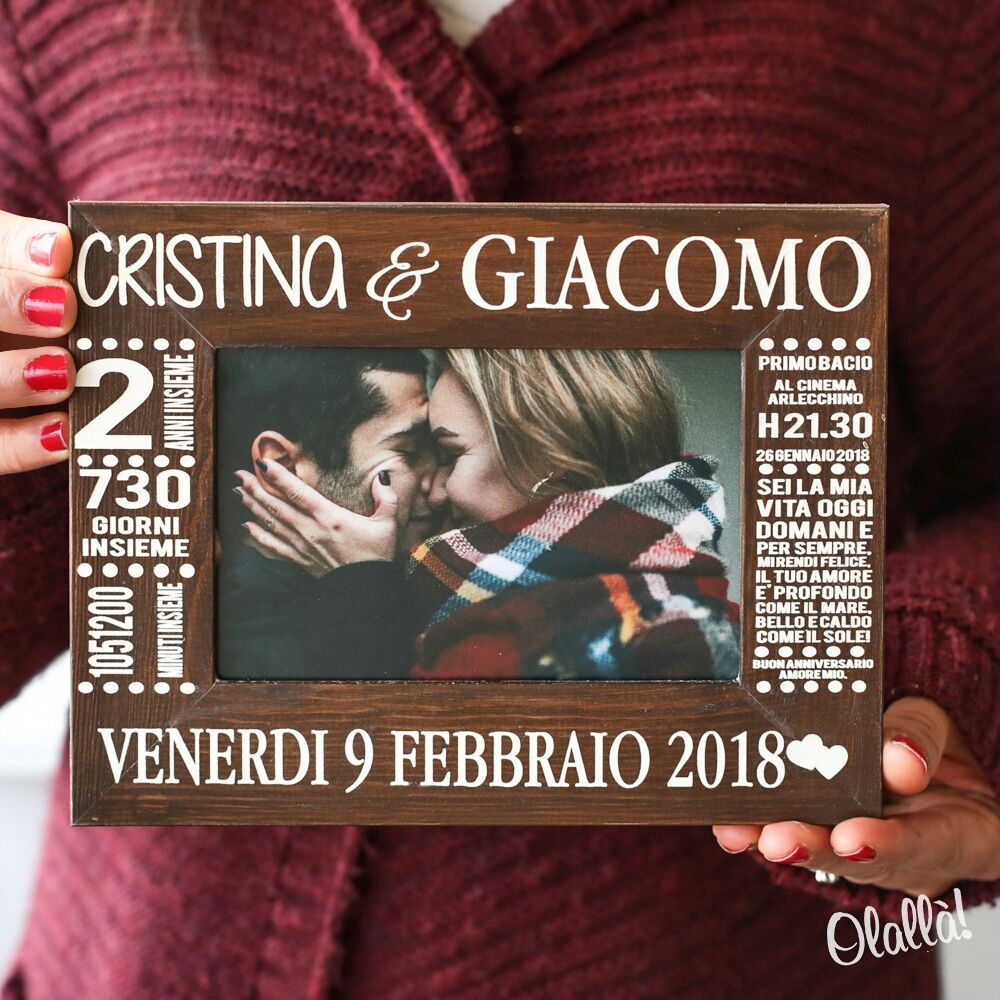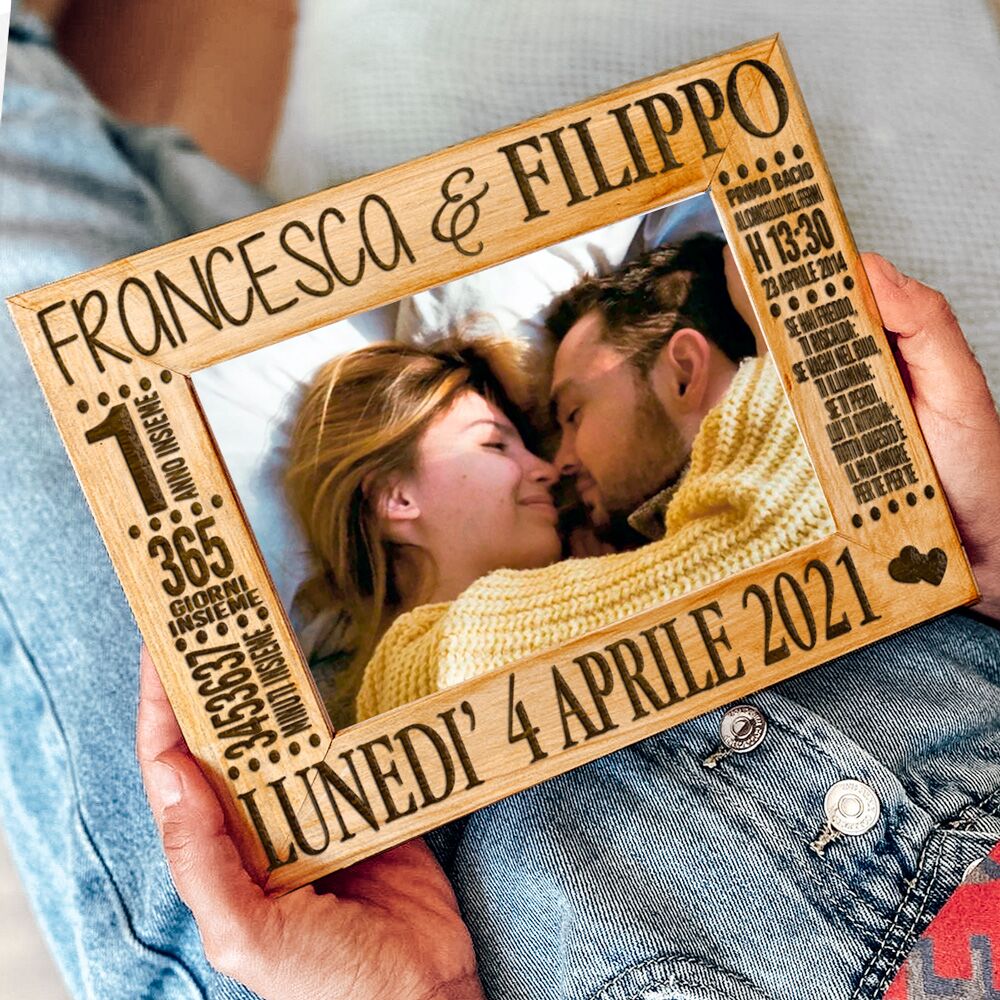 Ho ordinato questa cornice in occasione del mio anniversario di fidanzamento, i tempi di spedizione sono stati velocissimi per non parlare della disponibilità dello staff, la cornice che avevo preso era terminata e mi hanno realizzato quella più grande senza applicarmi nessun costo ulteriore. Appena l’ho vista me ne sono subito innamorata, è curata nei minimi dettagli, il legno è intagliato ed è super bello e resistente, la cosa più bella poi è puoi farci mettere la dedica che più ami. Adoro tutto. Grazie mille.