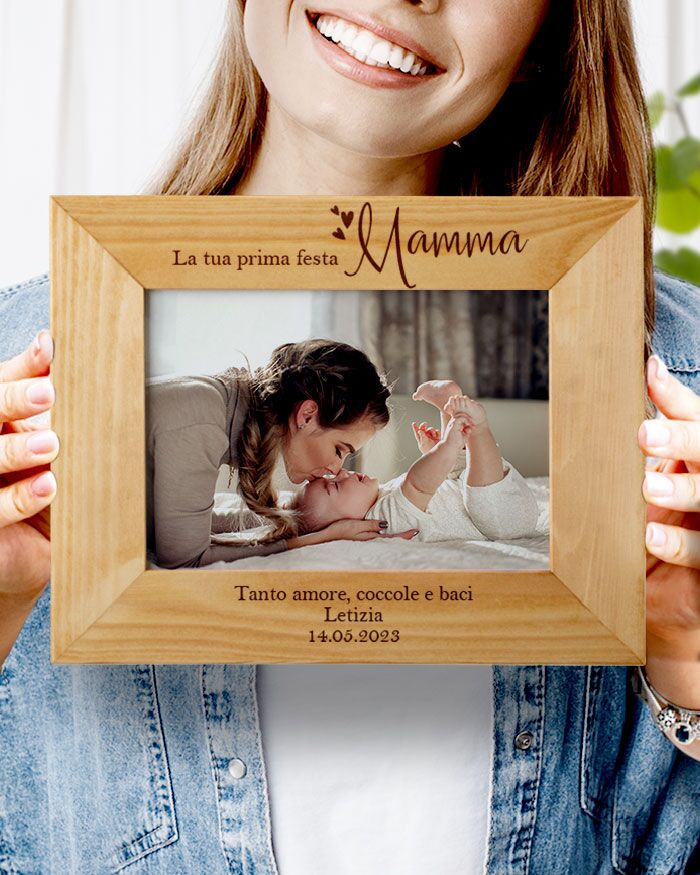 Splendida cornice in legno “La Tua Prima Festa della Mamma” personalizzata con incisione dedicata alla Festa della Mamma.