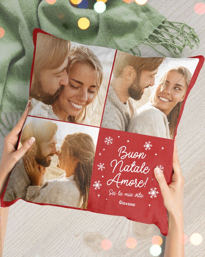 Dolcissimo cuscino natalizio personalizzabile con collage di 3 foto e dedica. Rendi speciale il primo Natale del tuo bimbo o bimba con questo cuscino su cui puoi immortalare i momenti più belli del suo primo anno di vita.