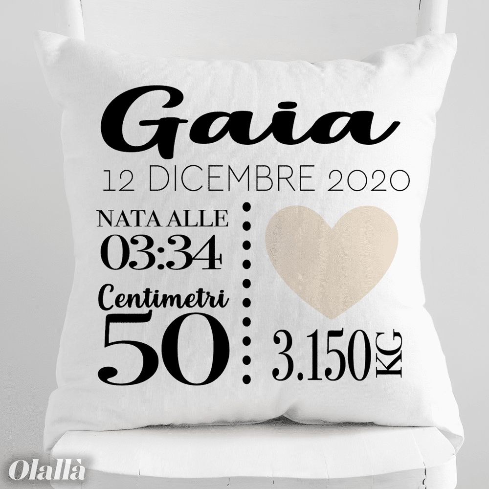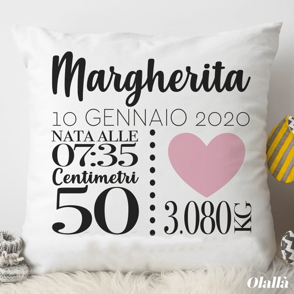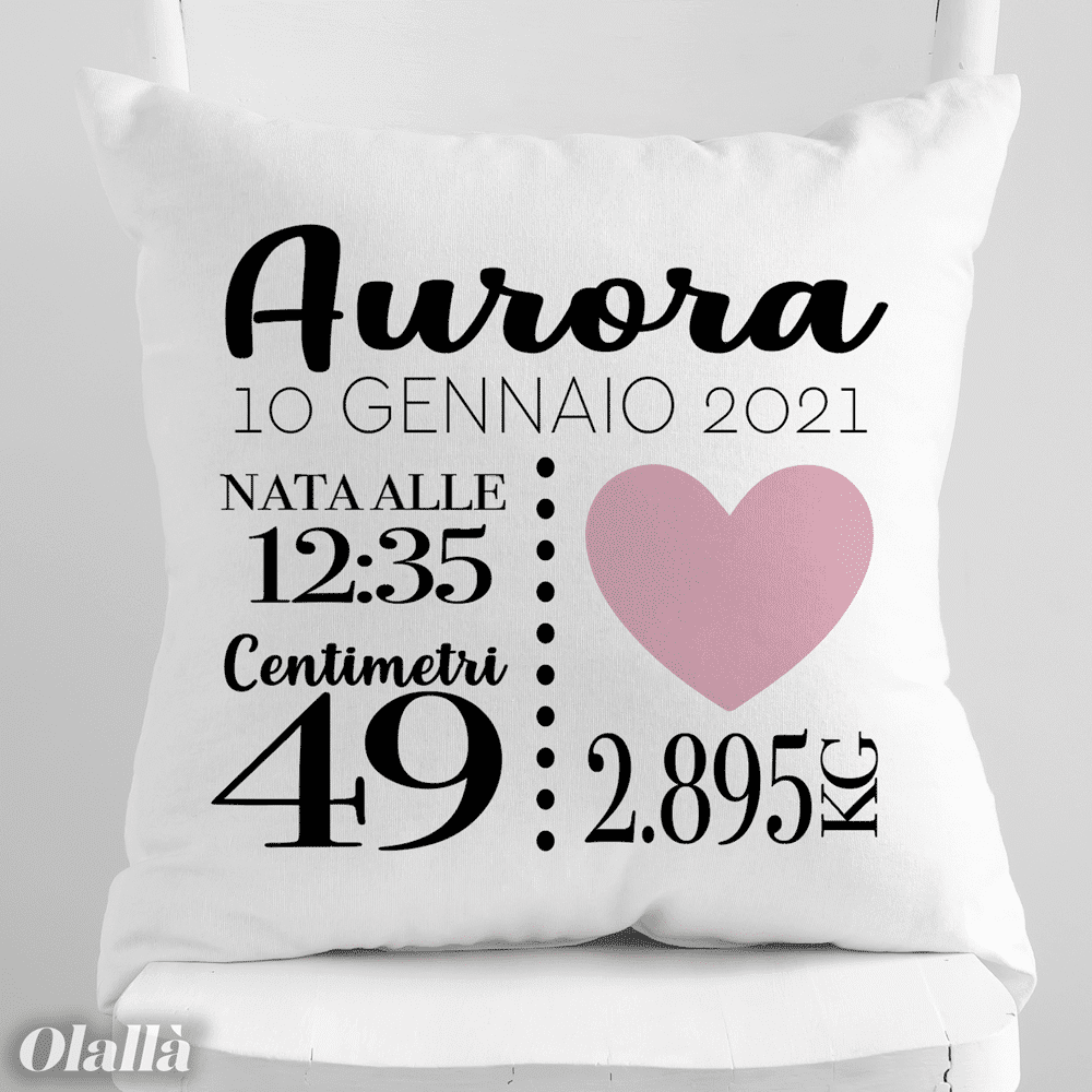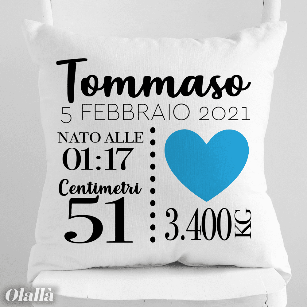 Dolcissimo cuscino personalizzato con tutti i dati di nascita del nuovo bebè arrivato in famiglia. Una fantastica idea regalo per una nuova nascita, per celebrare l’evento in modo inconfondibile e originale.
