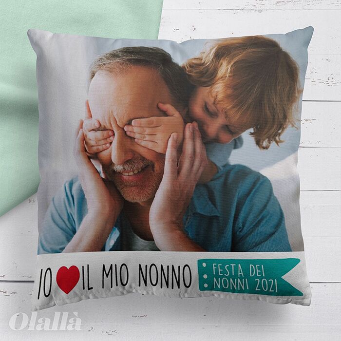 Cuscino con la tua foto e dedica con cuore pensata per i nonni. Aggiungi la foto che ritrae il tuo bimbo assieme ai suoi nonni, personalizza la tua dedica, completa con la frase che desideri sia stampata sul retro e realizza il tuo regalo speciale e super originale!