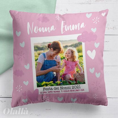 Splendido cuscino dedicato alla Nonna del tuo cuore. Aggiungi la foto che ritrae il tuo bimbo assieme alla sua nonna sulla polaroid, personalizza il nome e la tua dedica speciale, completa con la frase che desideri sul retro e realizza il tuo regalo speciale!