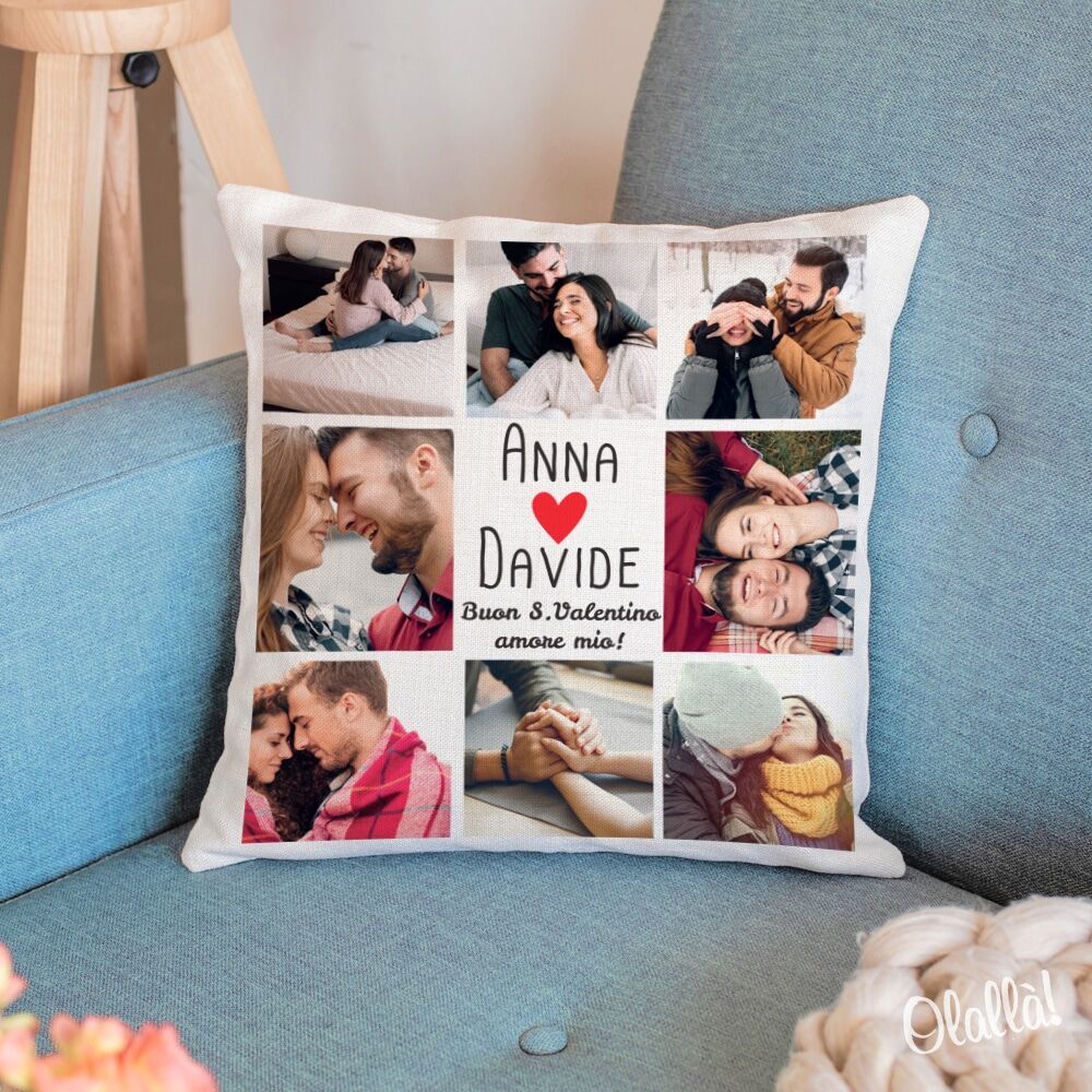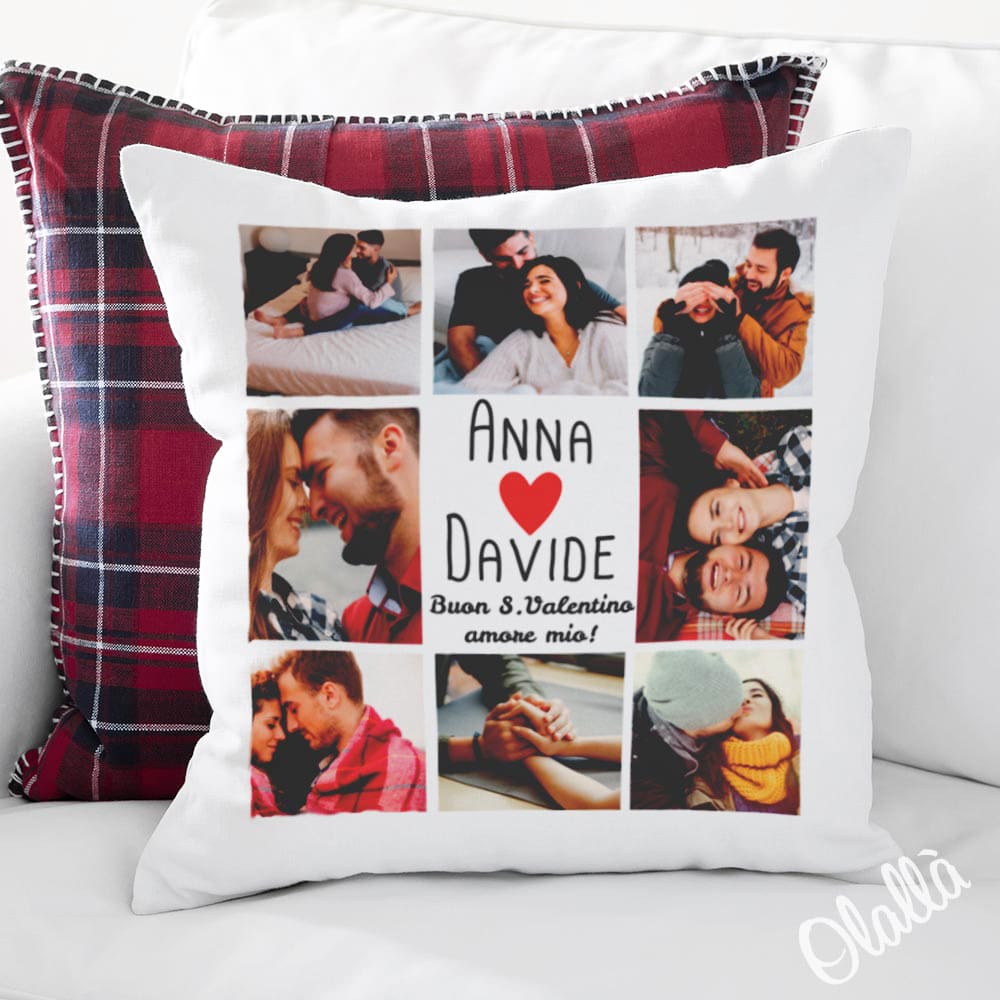 Romantico cuscino stampato e personalizzato con i vostri nomi, le vostre foto preferite e la tua dedica d’amore. Il regalo perfetto da fare a San Valentino o per l’anniversario, per festeggiare comodamente il vostro amore!