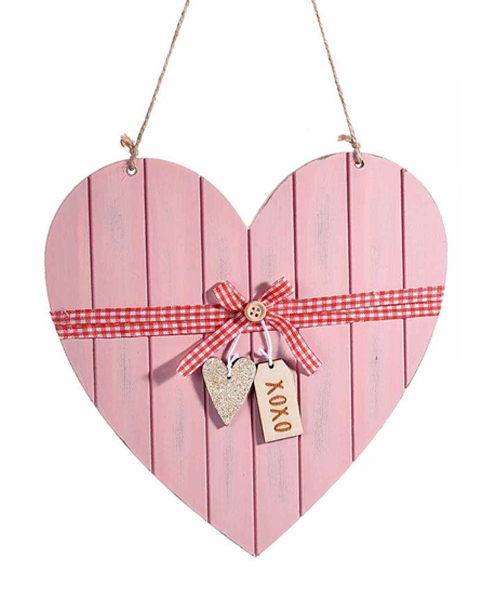 Dolcissimo cuore rosa in legno dallo stile country, con fiocco a quadretti rossi e bianchi e dettagli glitter.