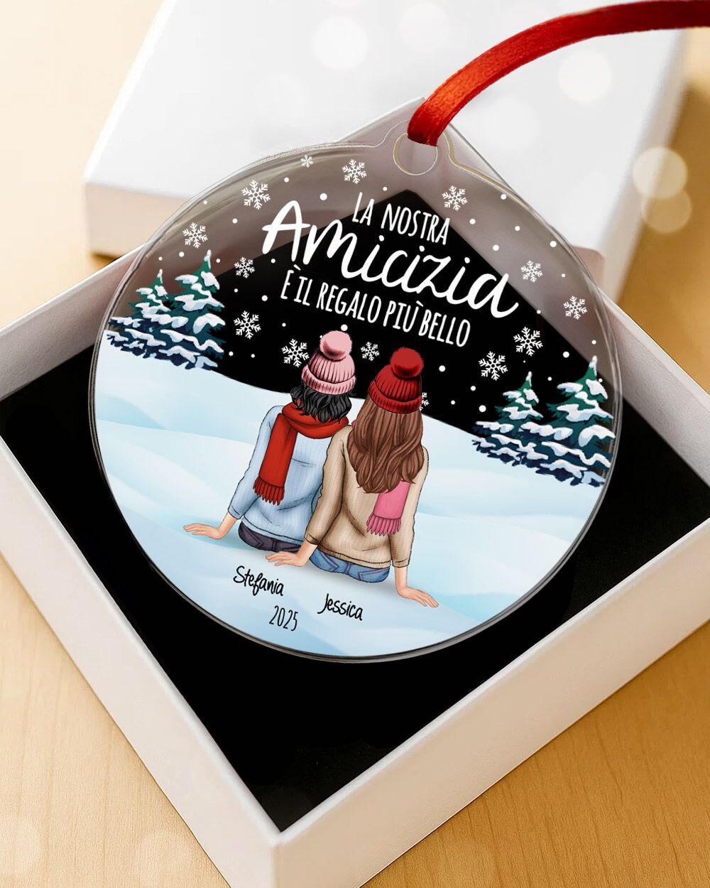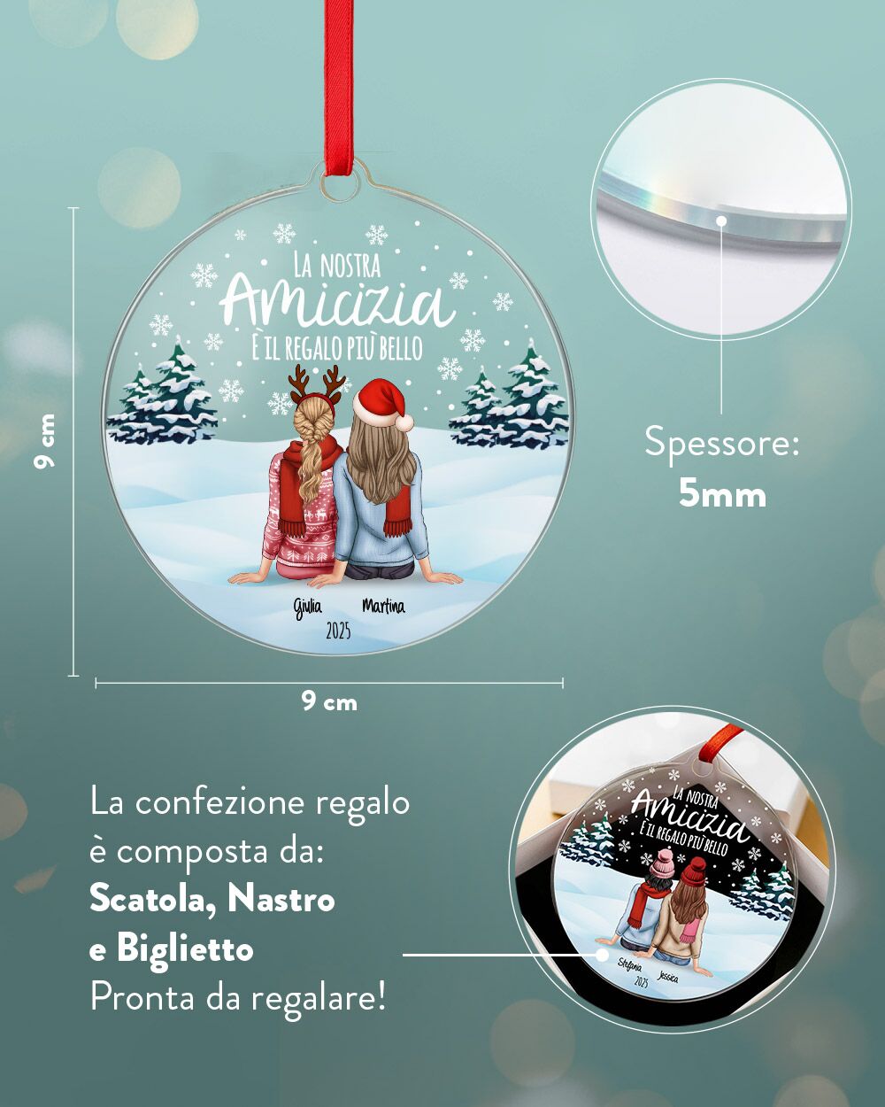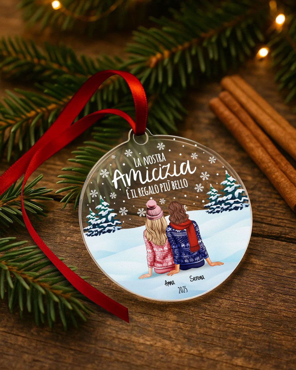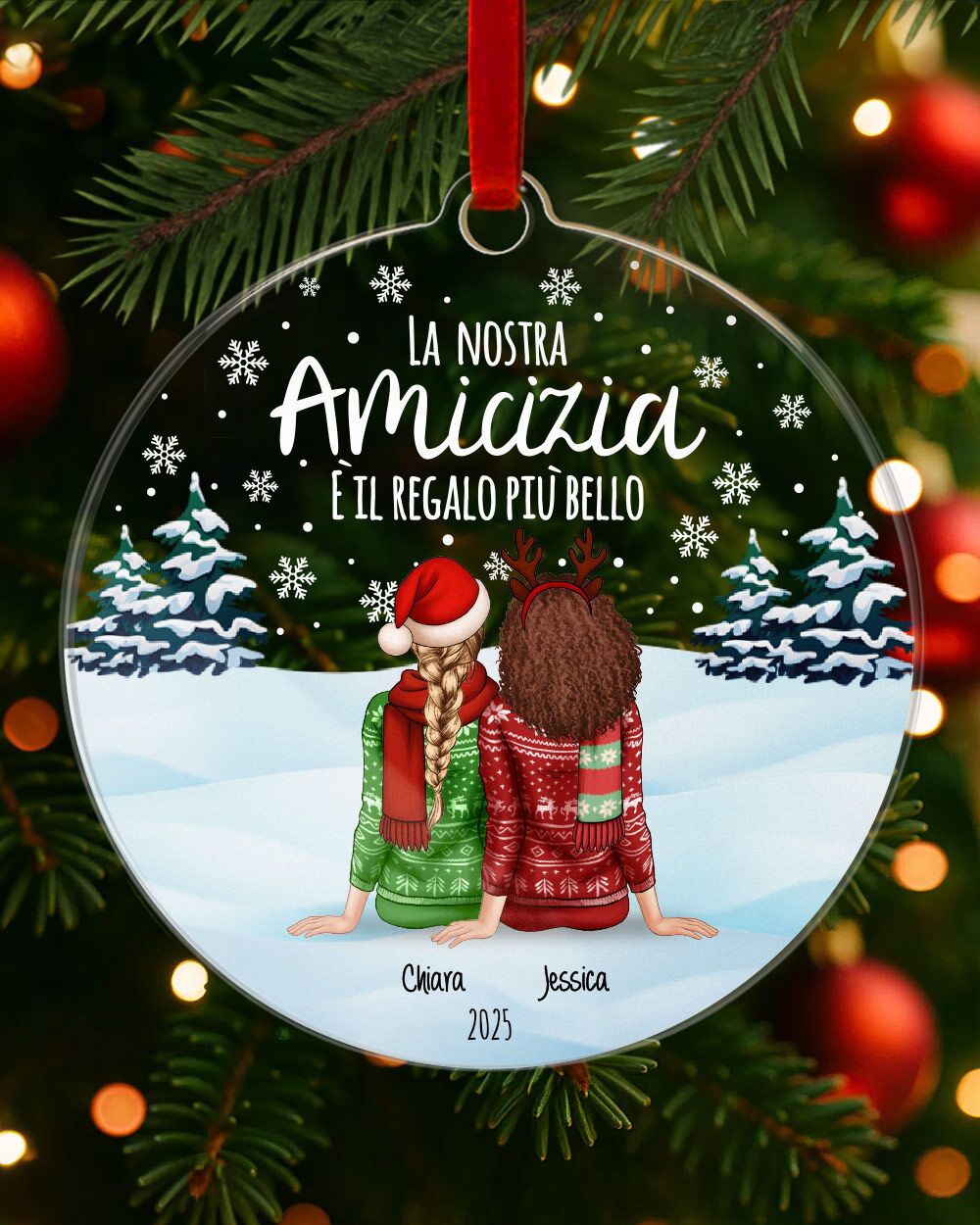 Il vero punto forte di questa decorazione di Natale è la possibilità di personalizzarla con un ritratto di voi due, viste di spalle, che simboleggia la vostra amicizia. Il ritratto è accompagnato da una dedica speciale, scelta da te, che rende la pallina ancora più personale. Ogni dettaglio è curato per rappresentare il legame unico che condividi con la tua amica, rendendo questo regalo un omaggio sentito e su misura. - Da appendere con nastro in raso Made in Italy