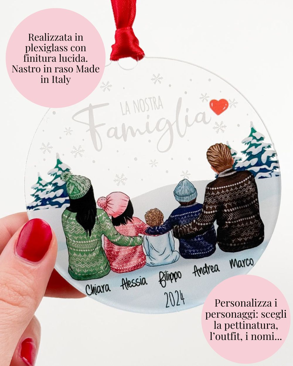 Se desideri fare un regalo che tocchi il cuore e che venga custodito con affetto per gli anni a venire, questa decorazione personalizzata è ciò che fa per te. La pallina di Natale, decorata con il ritratto stilizzato delle sagome della tua famiglia di spalle, rappresenta l’unione e l’amore che vi lega. Ogni volta che verrà appesa all’albero, ti ricorderà i momenti più preziosi vissuti insieme. - Rappresenta la tua famiglia