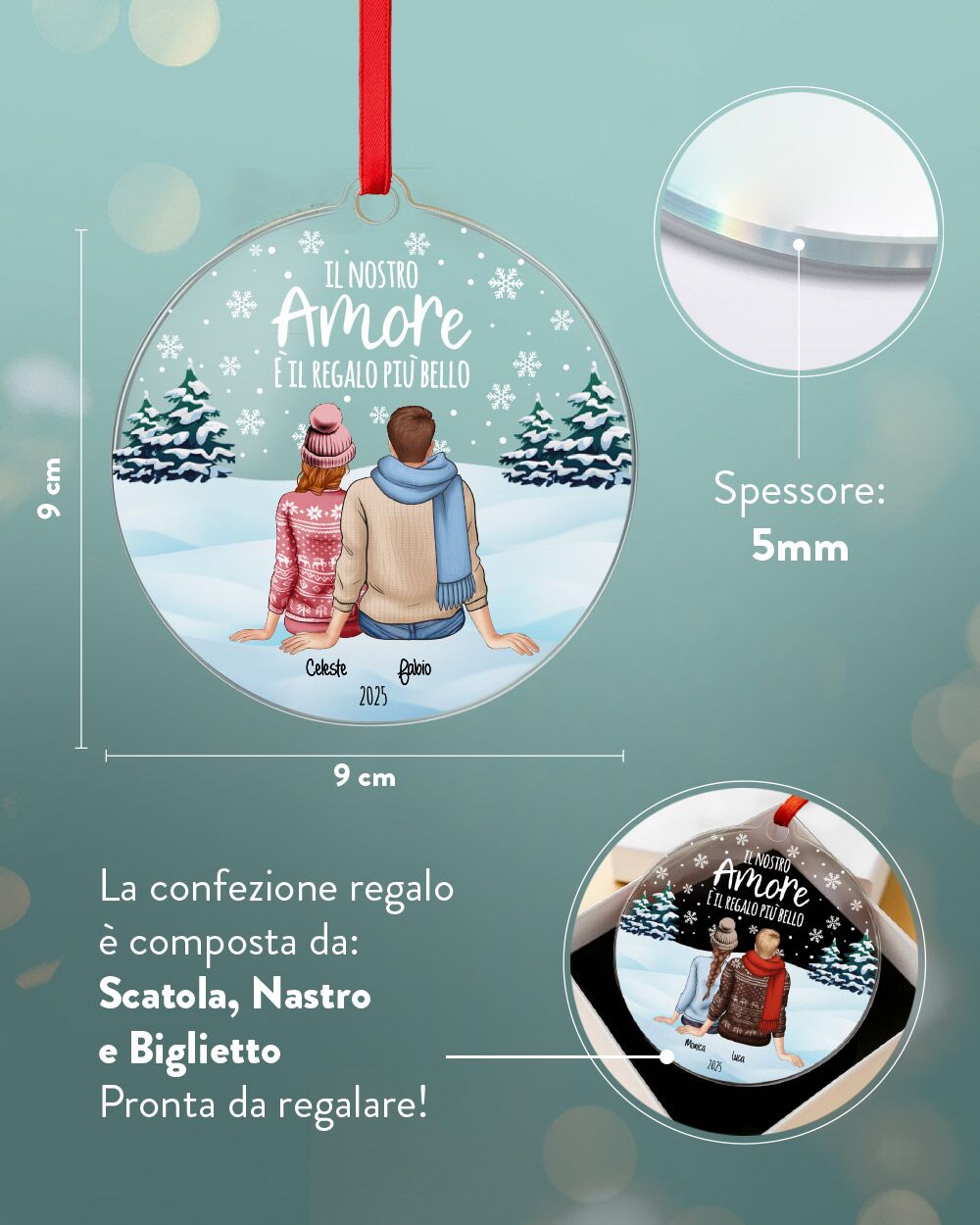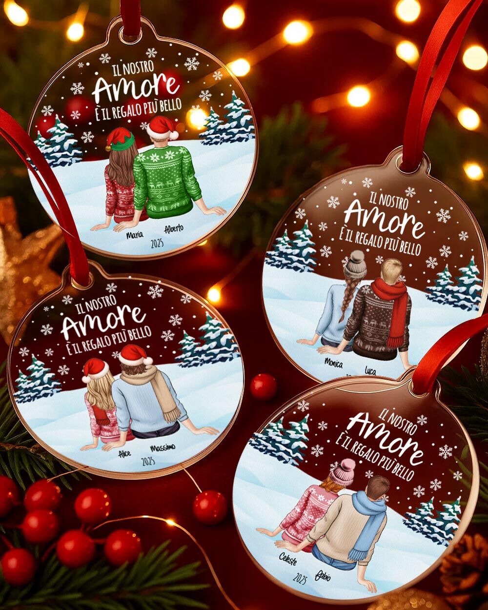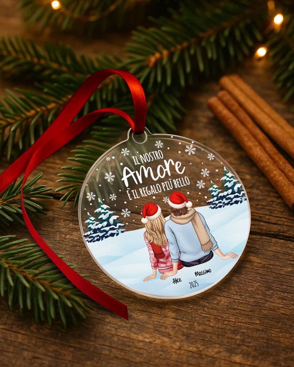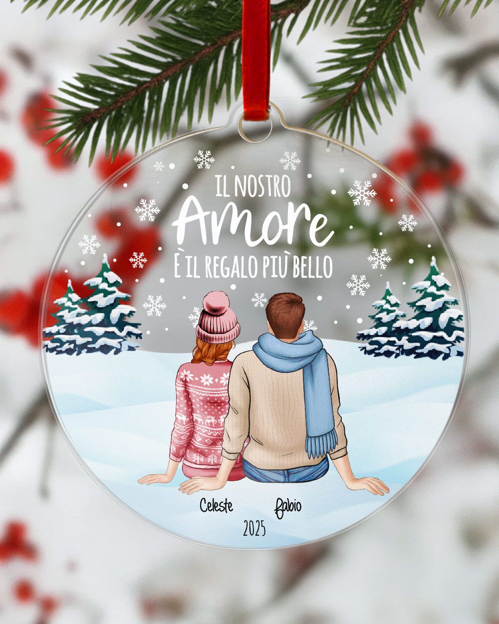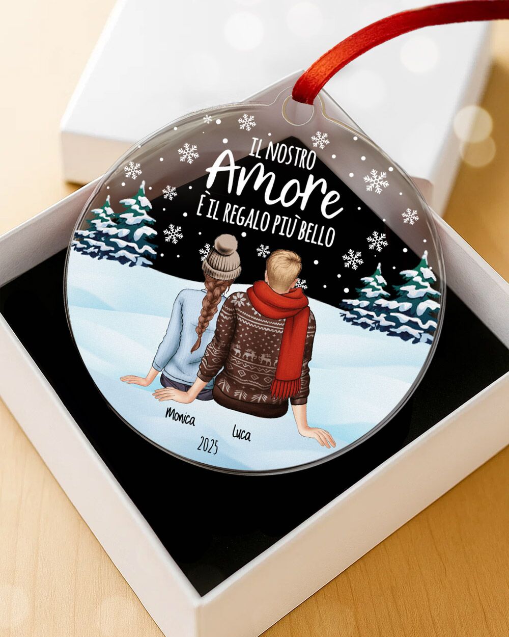 Decora l’albero di Natale con questa bellissima pallina di Natale personalizzata con una coppia di innamorati rappresentata di spalle. É perfetta per adornare l’albero di Natale e come gradito regalo per le persone che ami in occasione del Natale!