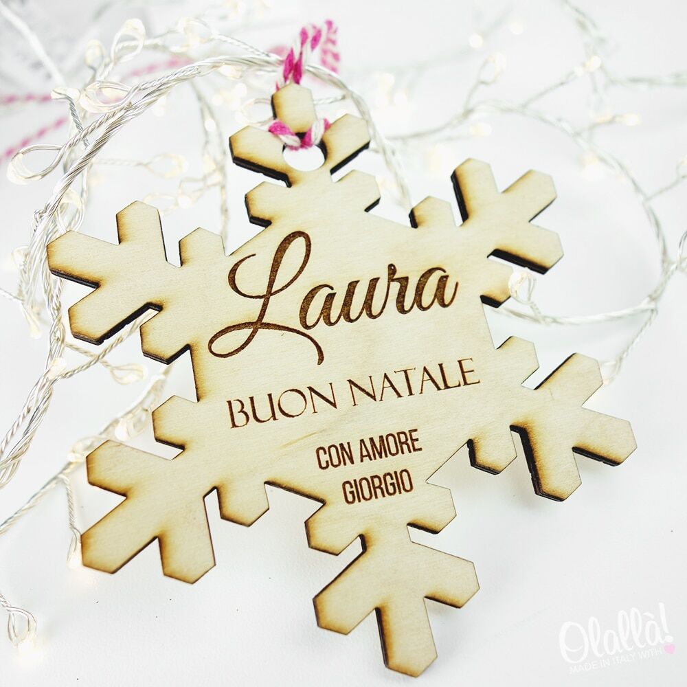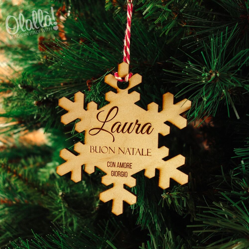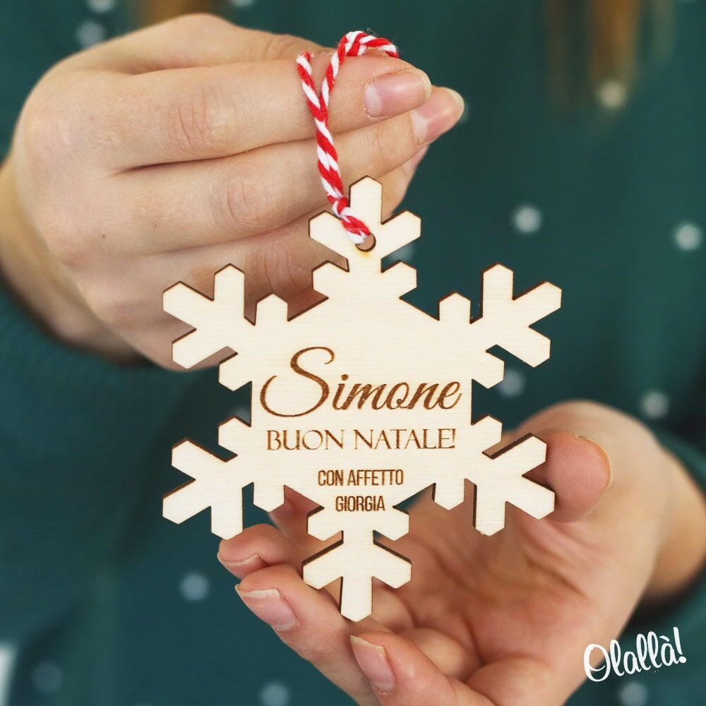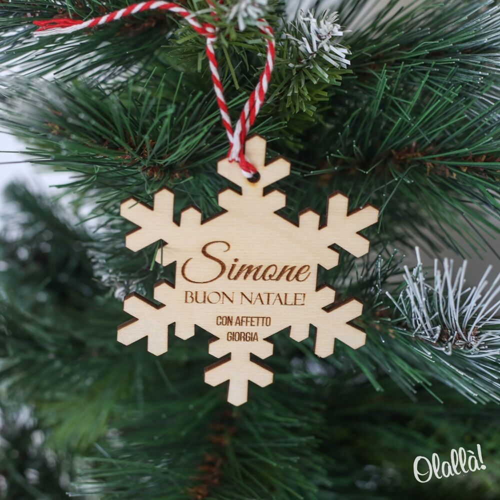 Carinissima decorazione da appendere all’albero di Natale a forma di fiocco di neve personalizzata con il vostro messaggio di auguri.