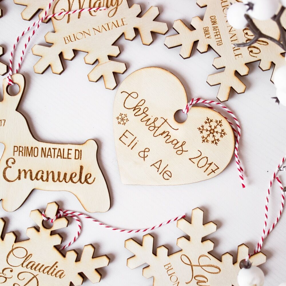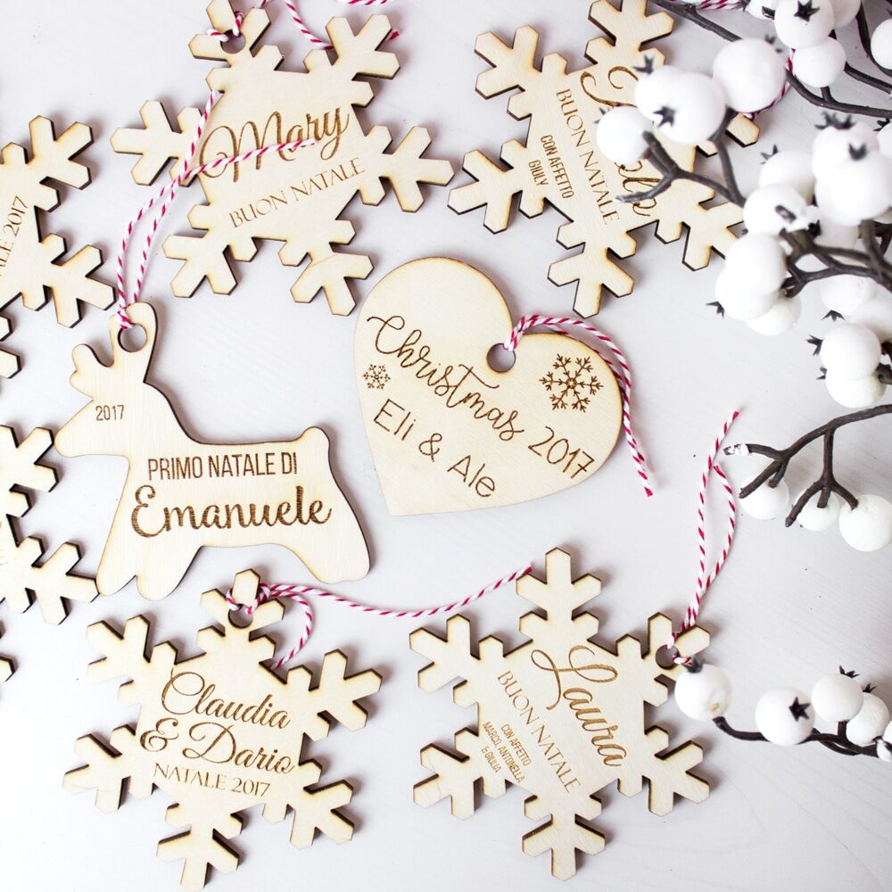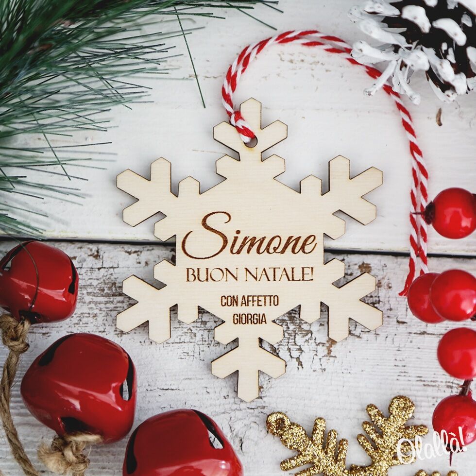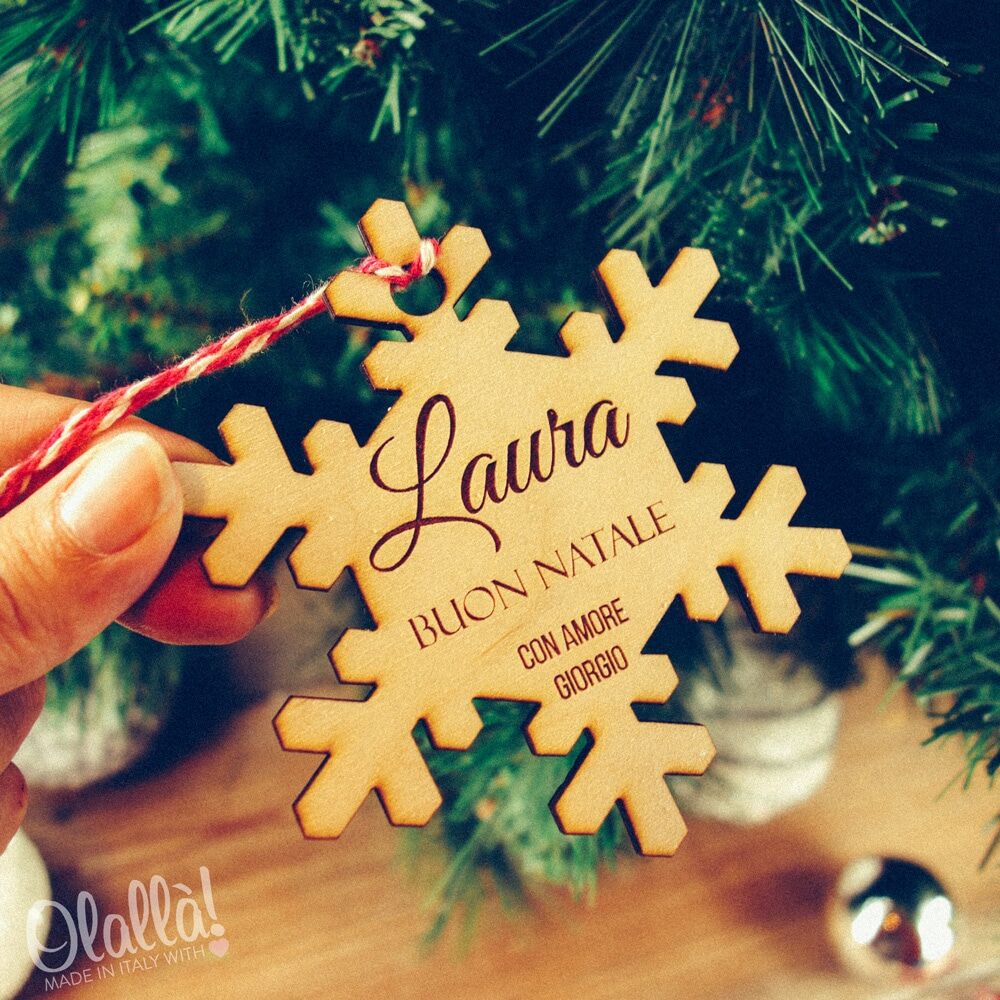 Carinissima decorazione da appendere all’albero di Natale a forma di fiocco di neve personalizzata con il vostro messaggio di auguri.