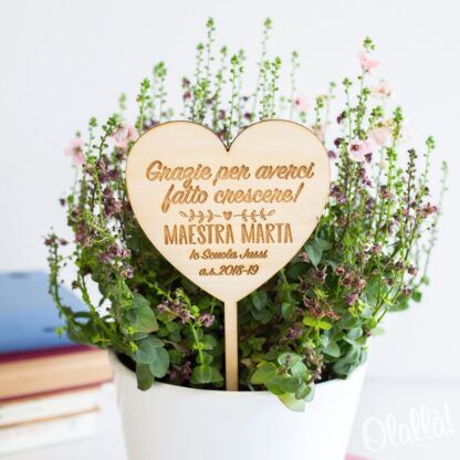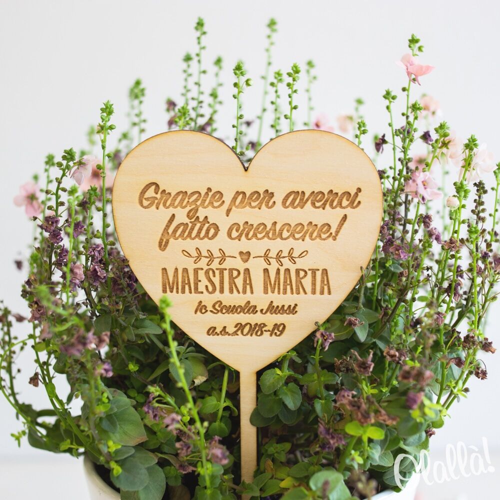 Decorazione per pianta in legno personalizzabile con una frase a scelta che verrà incisa a laser. Un regalo dolcissimo per la tua maestra del cuore.