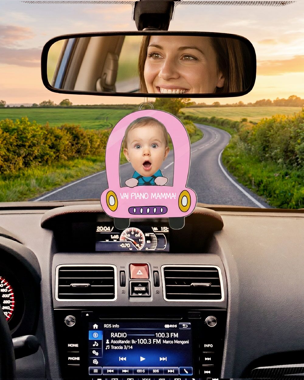 Ogni mattina, prima di mettere in moto, la mamma guarda lo specchietto retrovisore — e da oggi, ci trova il sorriso del suo bambino. Questa decorazione in plexiglass personalizzata con foto trasforma un momento qualunque della giornata in un piccolo gesto d’amore permanente. La macchinina cartoon colorata porta stampata la faccia del piccolo, realizzata a partire dalla foto che carichi direttamente nel configuratore: il risultato è un oggetto compatto (9,5 × 7 cm), leggero, resistente e assolutamente irresistibile — pronto da appendere allo specchietto retrovisore grazie al cordino incluso.