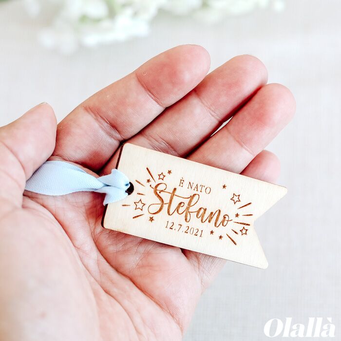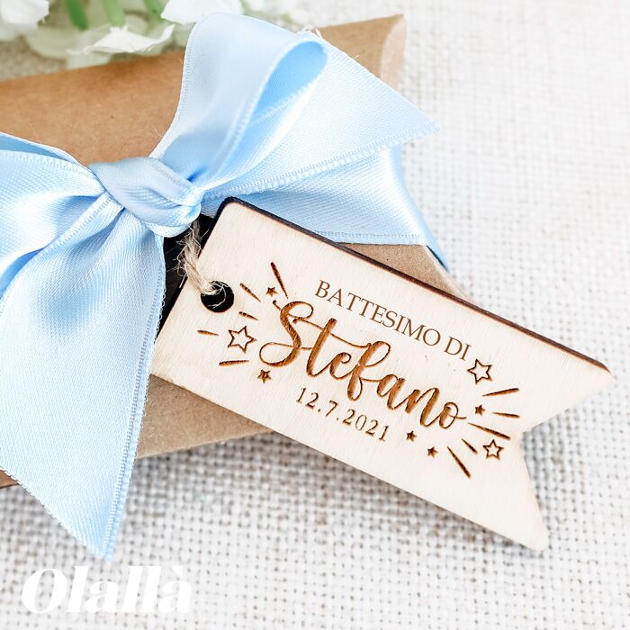 Deliziosa tag intagliata nel legno con stelline e personalizzate con l’incisione del nome in stile calligrafico, frase e data del tuo evento. Ideale da applicare sulle bomboniere di battesimo o nascita. ATTENZIONE: Il prezzo varia a seconda della quantità acquistata: più pezzi acquisti meno costerà il singolo tag.