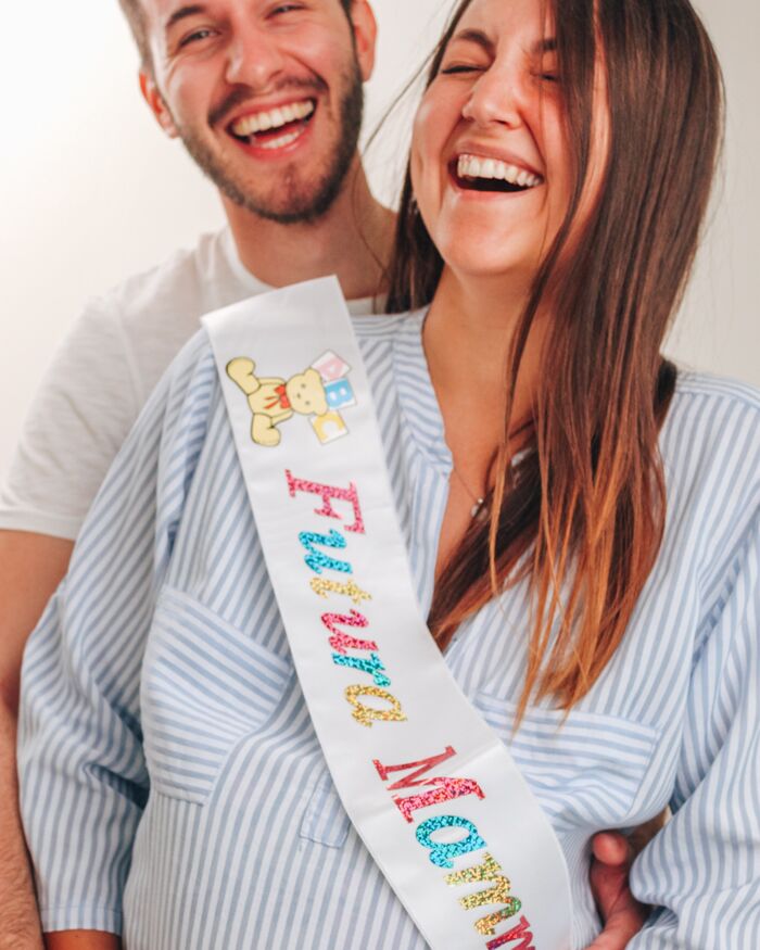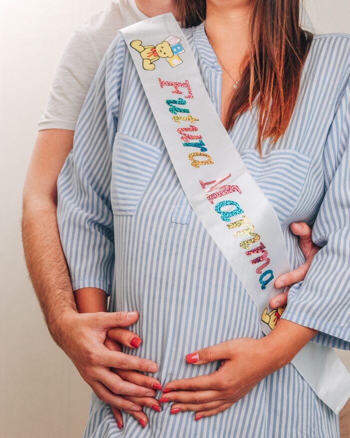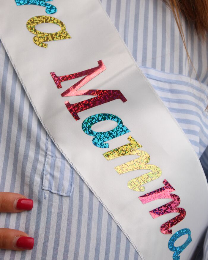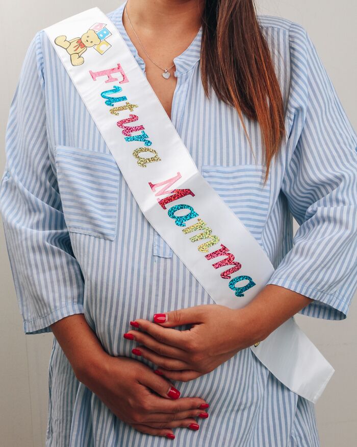 fascFascia bianca con la scritta “Futura Mamma” in multicolore. Le scritte non sono personalizzabili.