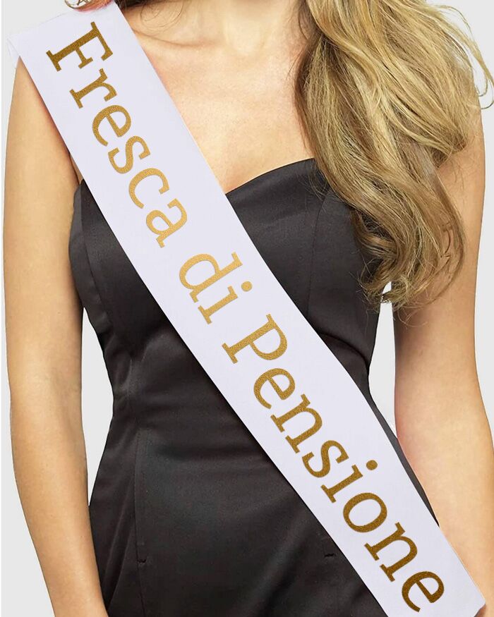 Fascia bianca con scritta oro “Fresca di pensione”.