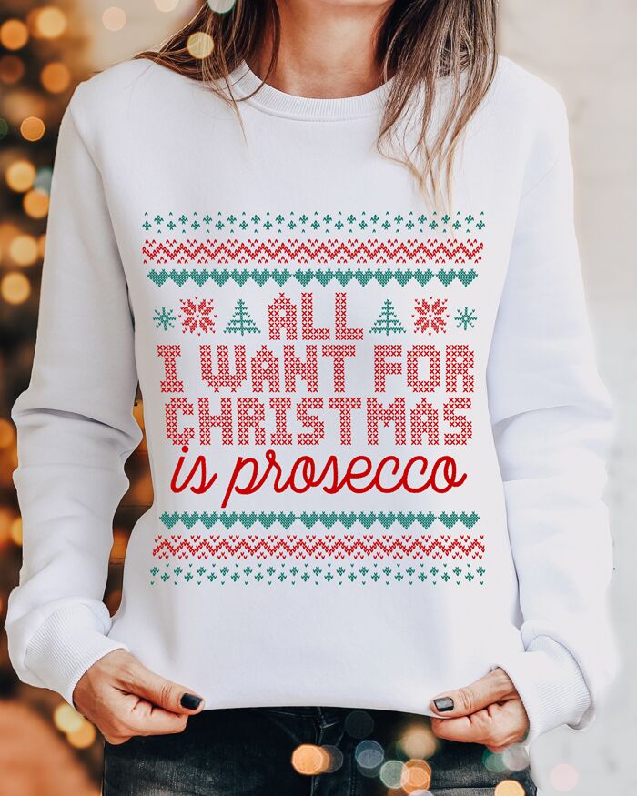 Felpa Natalizia “All I Want For Christmas Is Prosecco” – Idea Regalo Natale Divertente per Lei