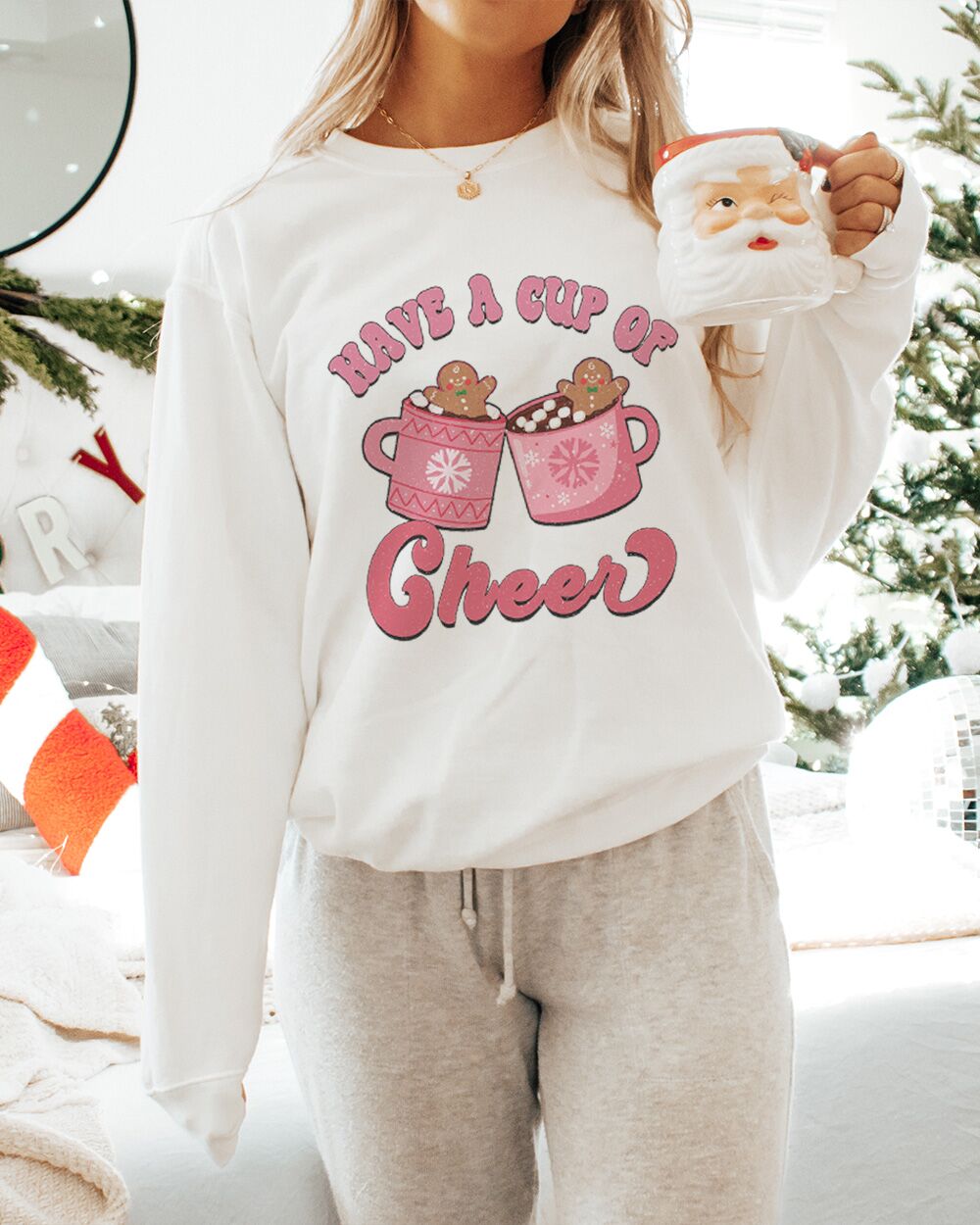 Il design di questa felpa è caratterizzato da una grafica in stile retrò nei toni del rosa, che aggiunge un tocco di dolcezza e vivacità al capo. La frase “Have a Cup of Cheer” è stampata in modo accattivante e contribuisce a creare un’atmosfera festiva. In italiano, questa frase si può tradurre come “Prenditi una Tazza di Allegria”. Questo invito metaforico all’ottimismo e alla gioia è perfetto per il periodo natalizio, suggerendo l’idea di riscaldarsi e rallegrarsi con qualcosa di piacevole e confortante, proprio come una tazza di qualcosa di caldo e rinvigorente.