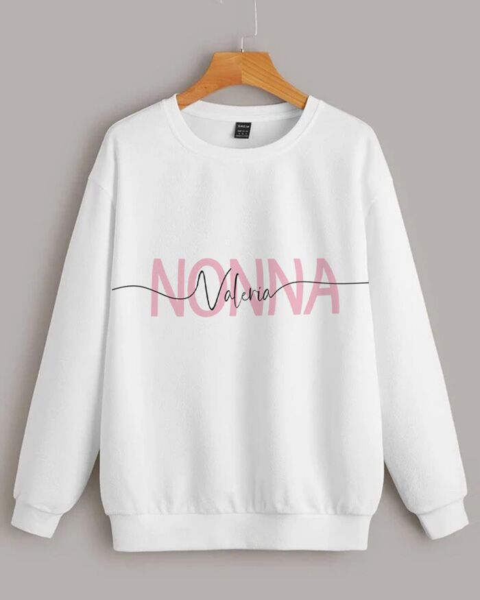 Bellissima Felpa Personalizzata con la scritta “Nonna” e il nome della tua nonna, perfetta per la tua nonna del cuore! Stupisci la nonna che la riceverà in occasione della Festa dei Nonni o del suo compleanno. Questa morbida e calda felpa personalizzata sarà un regalo gradito dalla tua nonna, che non vedrà l’ora di indossarla nelle fredde giornate autunnali.