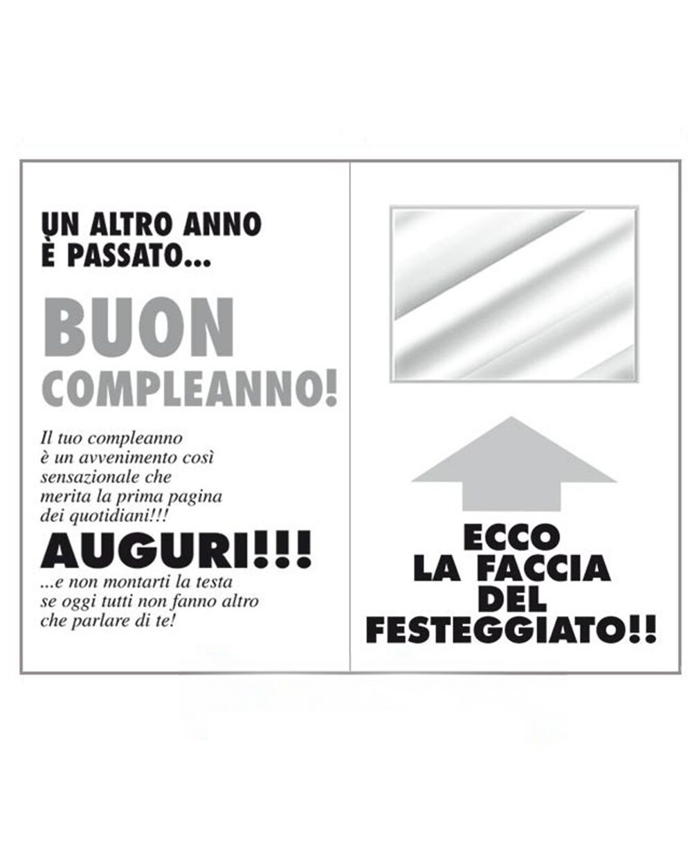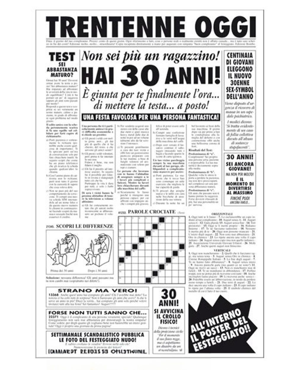 Questo non è un semplice biglietto di auguri, ma un’edizione speciale che imita alla perfezione l’aspetto di un vero quotidiano, con articoli e titoli creati appositamente per celebrare il tuo amico nel giorno del suo trentesimo compleanno. Dimensionato in maniera imponente, 32 cm di larghezza per 49 cm di lunghezza, contiene al suo interno una sorprendente carta a specchio: girando la pagina, il festeggiato si troverà davanti il proprio riflesso, protagonista assoluto di questa edizione completamente dedicata a lui!