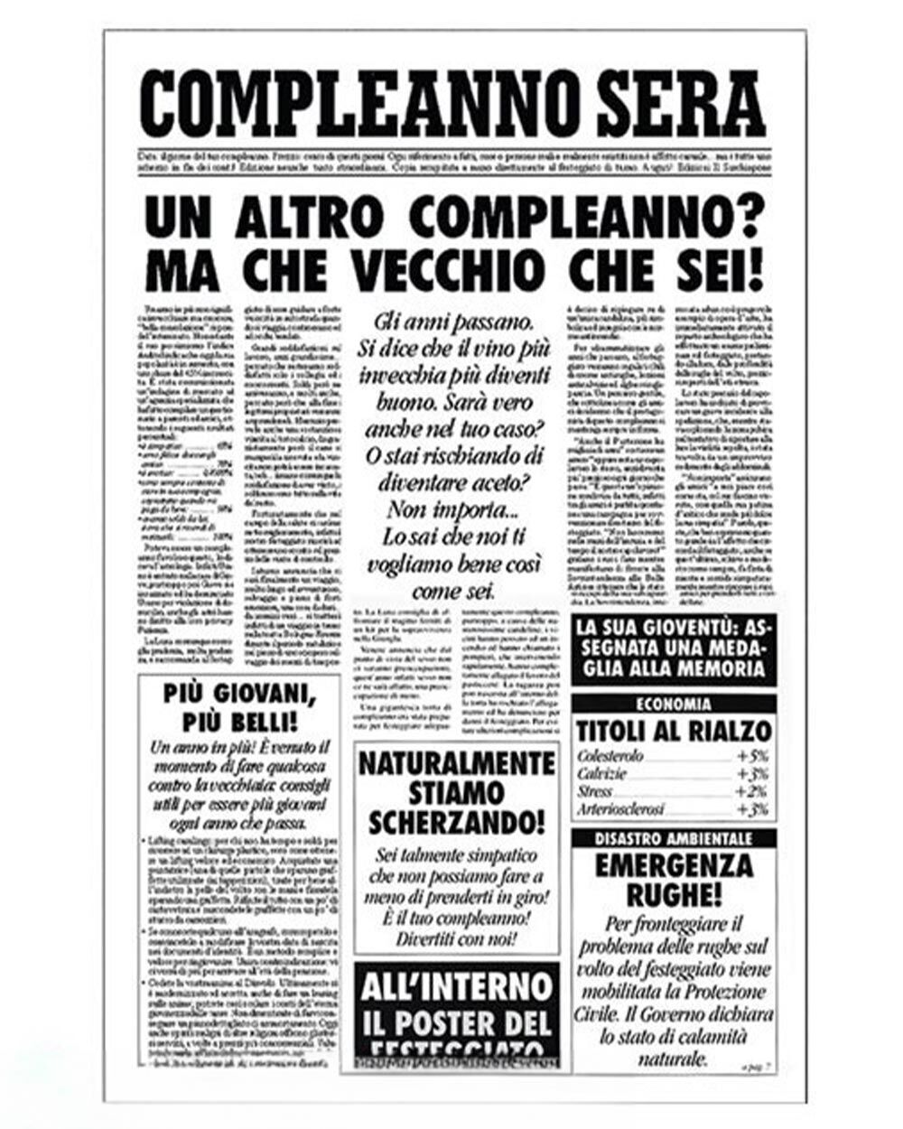 Questo bigliettone, creato con un tocco di ironia sullo stile dei quotidiani, è pensato per aggiungere allegria alla festa, giocando con l’idea che il festeggiato possa invecchiare come un buon vino… o forse, stia iniziando a diventare aceto. Tra gli articoli satirici, troverai avvisi buffi come l’allarme della protezione civile per un’invasione di rughe e la concessione di una medaglia alla memoria per gli anni che passano.