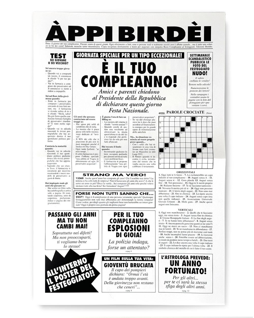 1. Un Biglietto d’Auguri Esilarante: non è il solito augurio di compleanno. La Finta Pagina di Giornale si presenta come un quotidiano dedicato al festeggiato, con notizie immaginarie e titoli spiritosi che faranno ridere a crepapelle chiunque lo legga. È un modo unico per celebrare un compleanno speciale, facendo sentire il festeggiato al centro dell’attenzione con un tocco di ironia e leggerezza.