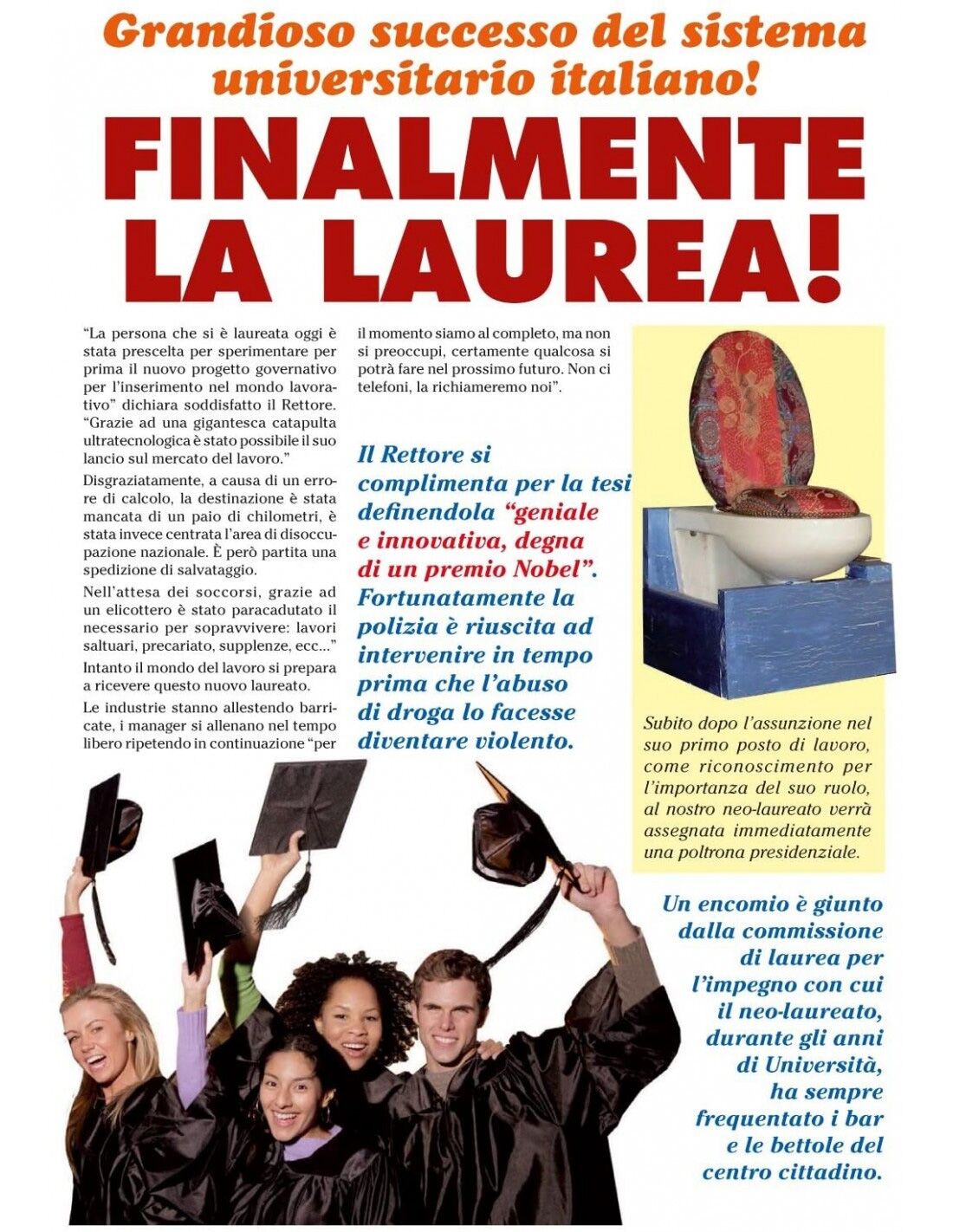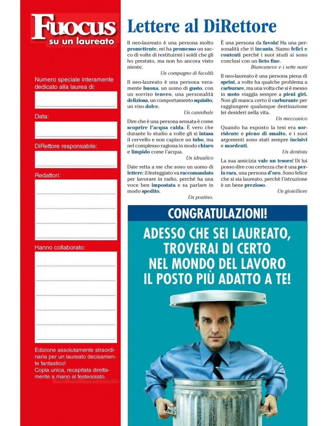 Simpaticissima finta rivista ispirata al giornale “Focus” con tante notizie scherzose, curiose e ironiche sul laureato e il tanto atteso e agognato giorno della laurea. Un modo originale per celebrare questo importante traguardo in maniera spiritosa e goliardica, così da strappare una fragorosa risata al fortunato neo-dottore che si ricorderà per sempre questo incredibile giorno!