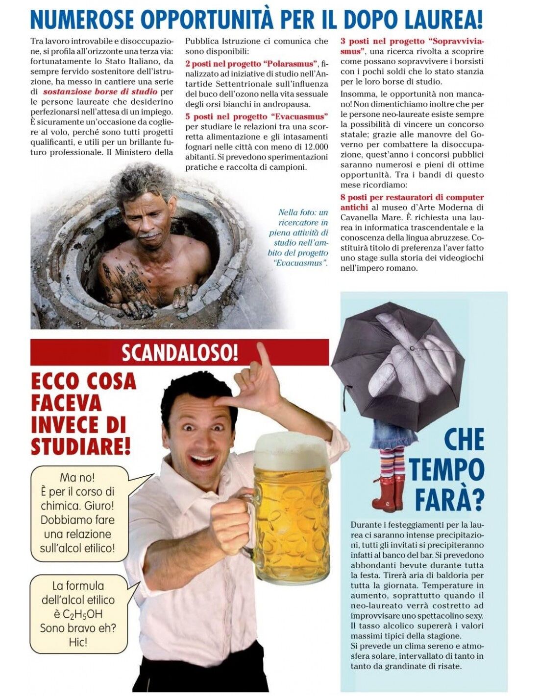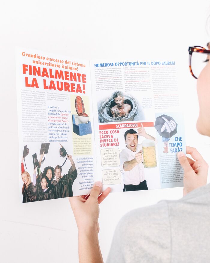 Rivista di 21×30 centimetri e 8 pagine, che puoi usare come biglietto alternativo, è pratica e colorata come i più famosi tabloid italiani e internazionali. Al suo interno, il neo-laureato troverà notizie, servizi, opinioni di lettori, giochi e test di vario genere, tutto giustamente incentrato su di lui e sul traguardo appena raggiunto. Per un giorno lo farai sentire davvero l’idolo delle folle e dei giornali!