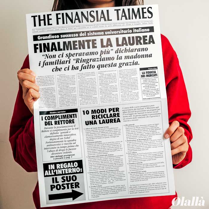 Questo finto giornale è perfetto per festeggiare in modo scherzoso il vostro amico o amica, oppure nipote, che ha appena raggiunto il traguardo tanto atteso. Si sostituisce simpaticamente al biglietto di auguri e contribuirà a creare il giusto clima di goliardia, tipico dei festeggiamenti di laurea. All’interno contiene un foglio di carta effetto specchio con la scritta “Ecco la faccia di una persona dal futuro brillante”: il festeggiato potrà quindi specchiarsi all’interno. La struttura è quella di un tradizionale quotidiano dove la notizia principale è proprio quella della novella laurea, raccontata in modo divertente e spiritoso.