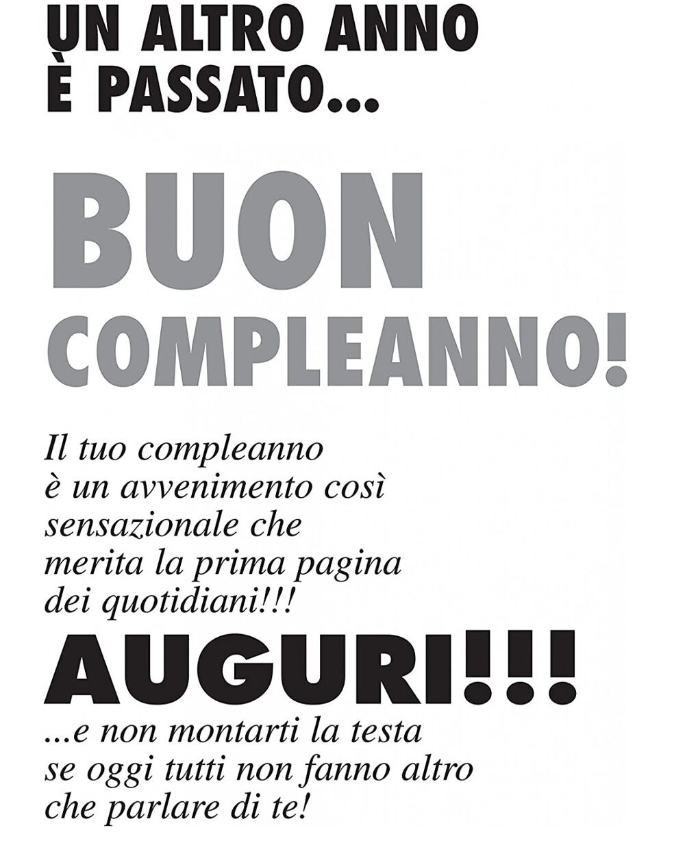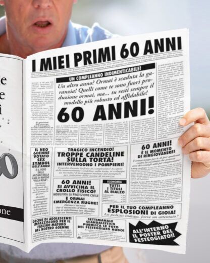 Finto giornale quotidiano di quattro facciate dalle dimensioni complessive di 44 x 61 cm che puoi usare come biglietto alternativo per augurare un buon 60esimo compleanno in maniera del tutto divertente e inaspettata! Adattissimo per festeggiare il compleanno di un amico, del nonno o di un collega, non mancherà di strappare una fragorosa risata al festeggiato che per un giorno si troverà ad essere protagonista di alcune pagine di un quotidiano.