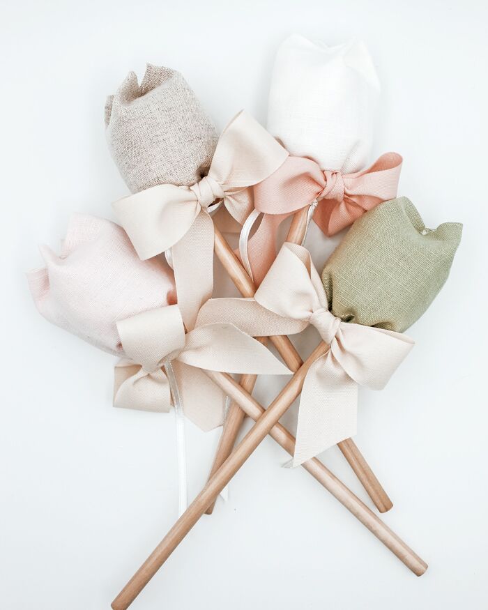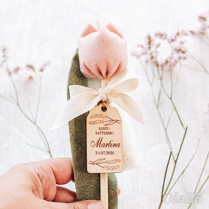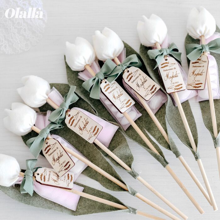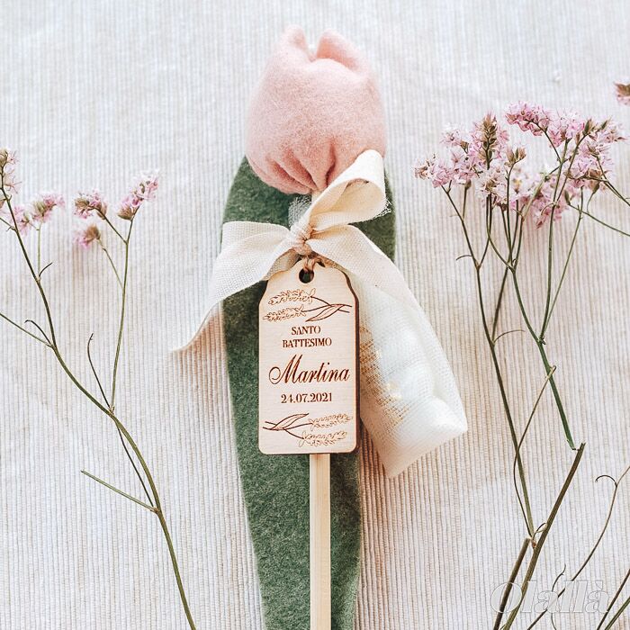 Delicati fiori di tulipano in tessuto da utilizzare come bomboniera per i tuoi eventi più belli. Tag in legno personalizzata con delicati fiorellini, nome e data. Dal battesimo alla comunione, dalla nascita al matrimonio, questi fiori potranno essere conservati per sempre dai tuoi invitati.