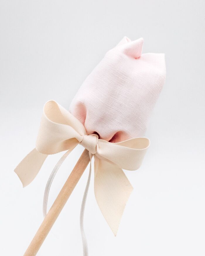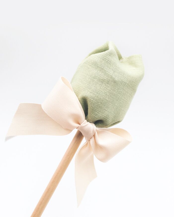 Fiori in tessuto di pannolenci realizzati in Italia artigianalmente. La foglia raccoglie il sacchettino in tulle che contiene 5 confetti di gusti a scelta. Disponibili in 3 tonalità di colori pastello, bianco latte, rosa antico e azzurro. Il bastoncino in legno che funge da stelo è lungo circa 30 cm, mentre i tulipani hanno un diametro di 5 cm circa.