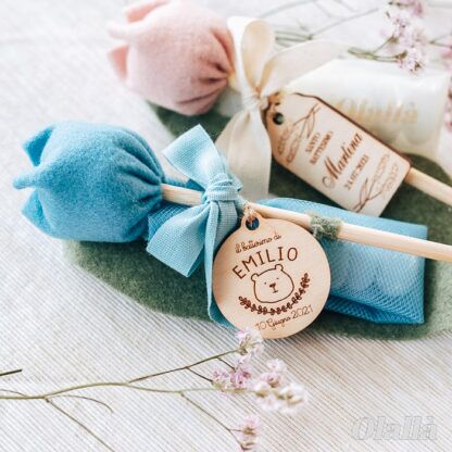 Delicati fiori di tulipano in tessuto da utilizzare come bomboniera per i tuoi eventi più belli. Tag in legno personalizzata con orsetto, nome e data. Dal battesimo alla comunione, dalla nascita al matrimonio, questi fiori potranno essere conservati per sempre dai tuoi invitati.