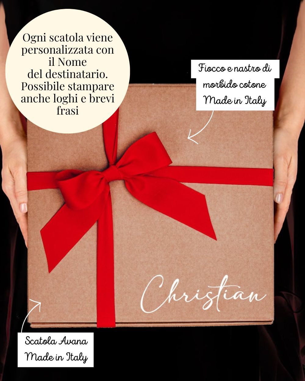 – La box misura 20x20x10 cm, è realizzata in cartone kraft e dentro contiene anche della paglietta. La parte superiore può essere personalizzata con il nome del destinatario.