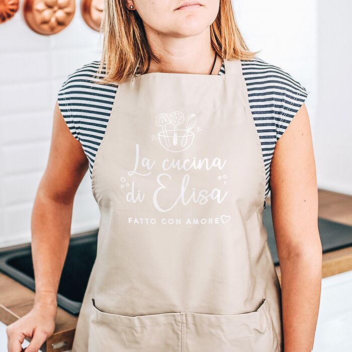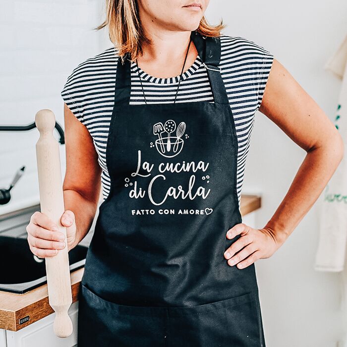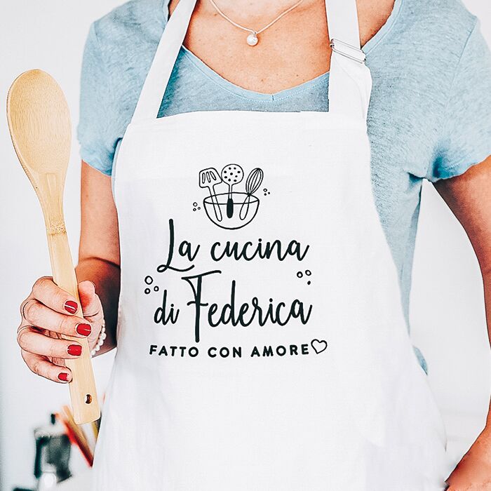 Grembiule personalizzato con il nome del destinatario e le tue parole. Una dolcissima idea regalo per la Mamma: che sia a Natale, per il suo compleanno o la Festa della Mamma, un dono così è davvero un’idea azzeccatissima per farla felice e speciale. Lo puoi personalizzare con il nome della persona a cui desideri regalarlo e con una frase speciale nella parte inferiore.